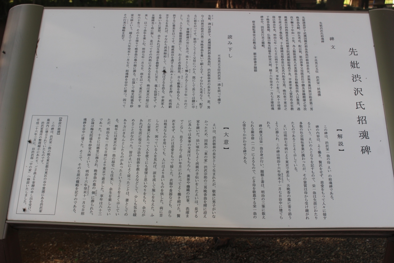 敷地は広く、渋沢栄一の父や母、若くして死んだ養子・尾高平九郎の石碑等があります。