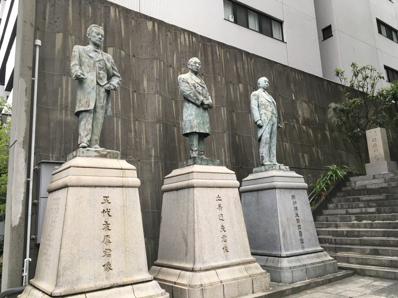 大阪商工会議所ビルの前、若宮商工稲荷神社の石段の下には、3つの銅像があります。その1つが五代友厚です。五代友厚は、江戸時代末期から明治中期にかけての武士、実業家で、大阪経済をけん引きした人物です。大阪商工会議所の初代会頭です。大阪市内には、いくつか五代友厚の像がありますので、興味がある方は、巡られては如何でしょうか。