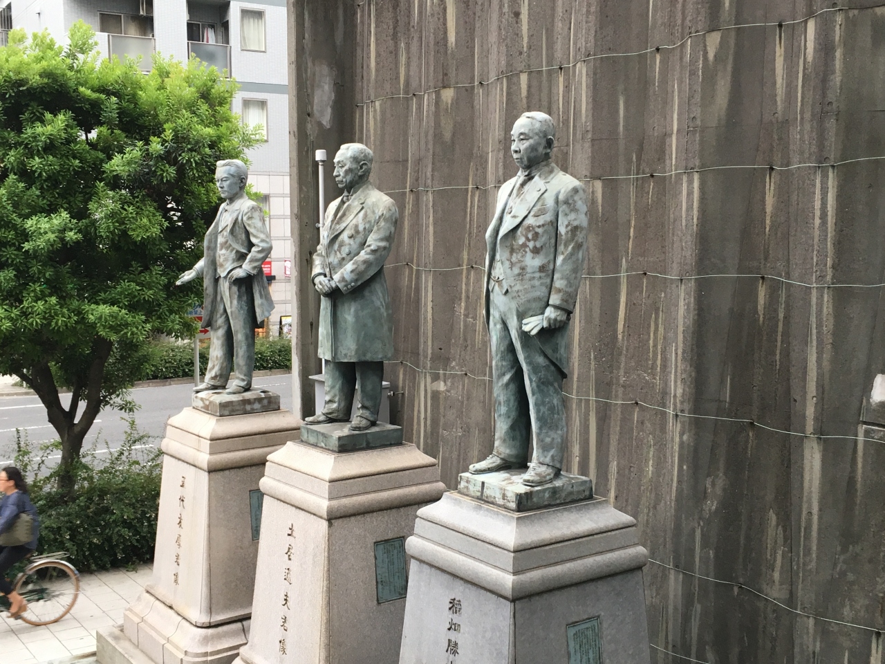 大阪商工会議所の前、若宮商工稲荷神社の石段の下に大阪商工会議所の初代会頭である五代友厚、7代会頭の土居通夫、10代会頭の稲畑勝太郎の像があります。稲畑勝太郎は、明治、大正、昭和前期の商人、実業家、政治家です。稲畑産業の創業者とのことです。興味がある方は見学されては如何でしょうか。