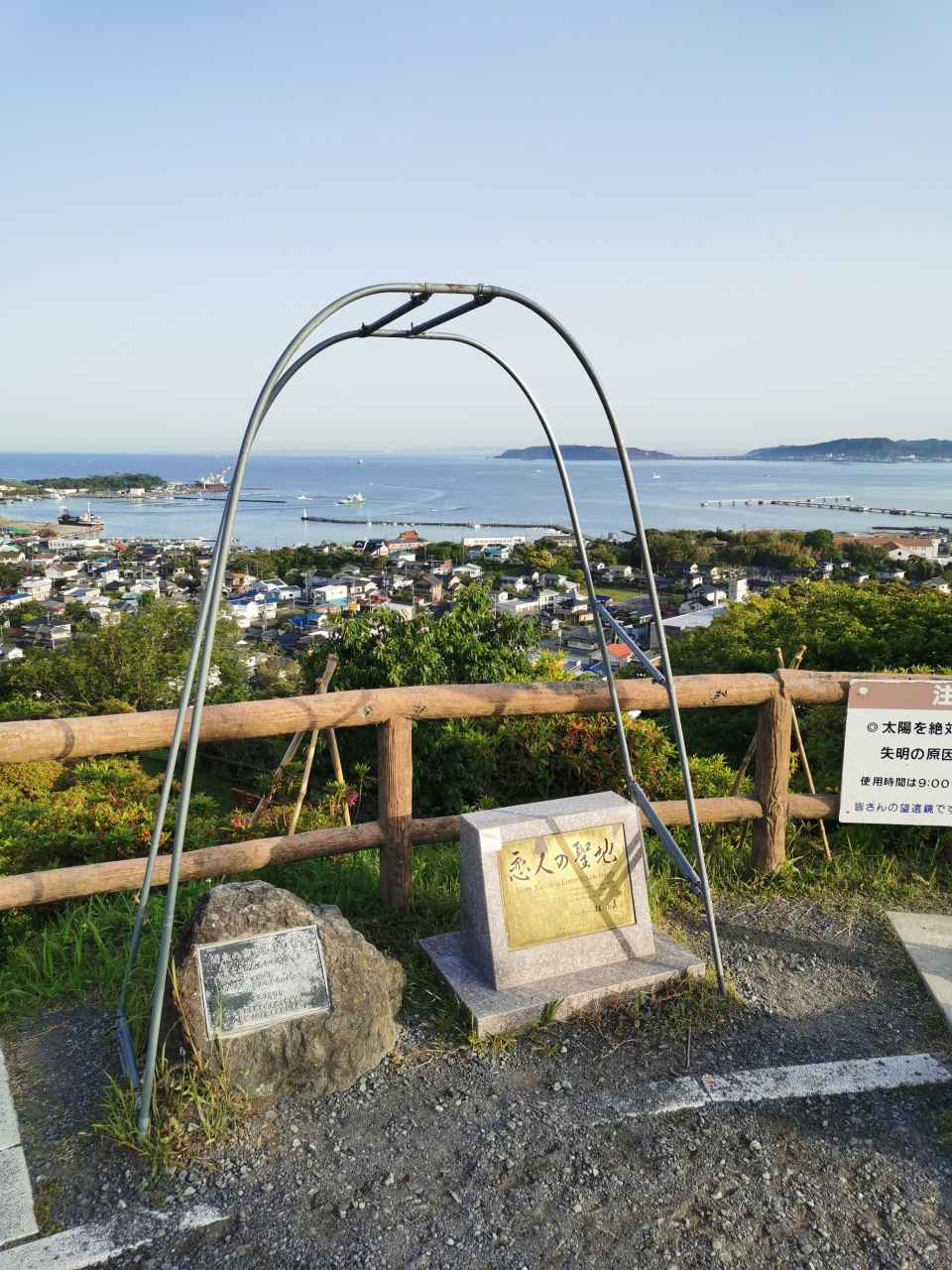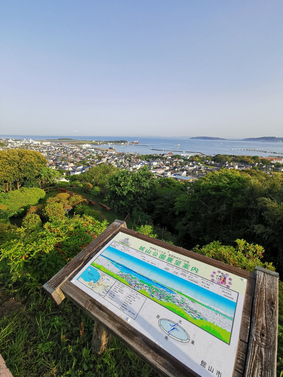 千葉県房総半島ドライブで早朝に館山市にある館山城の城山公園に立ち寄りました。無料の駐車場があります。入り口は少しわかりにくい。小高い山になっていますので天守閣までは上り坂です。よい運動になりました。頂上の館山城の裏手からは館山湾が一望です。恋人の聖地もあります。当日は天気もよく、とても素晴らしい景色が一望できました。