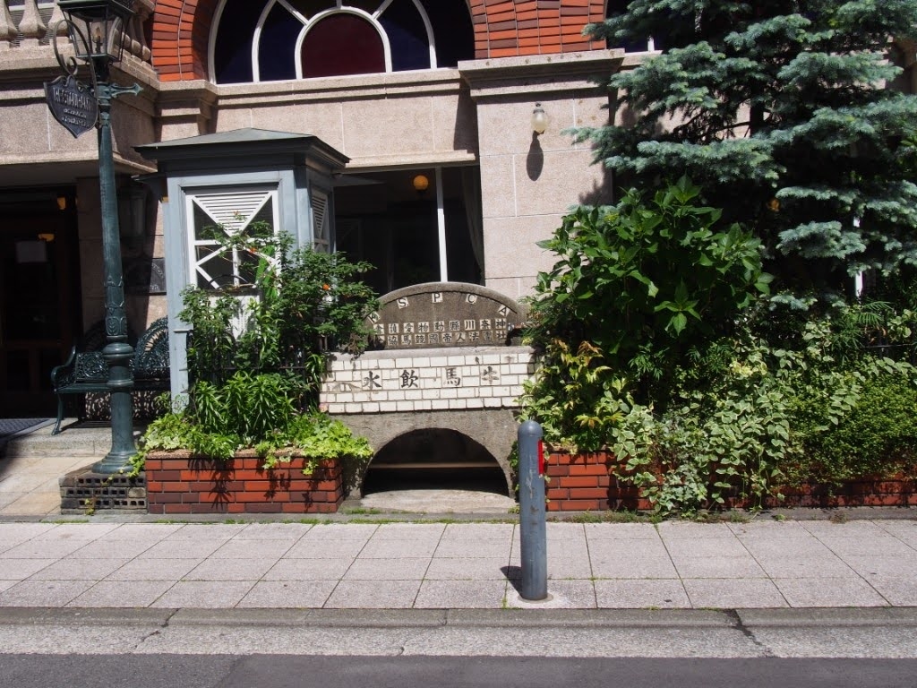 ガス灯と馬用の水飲み場が残る