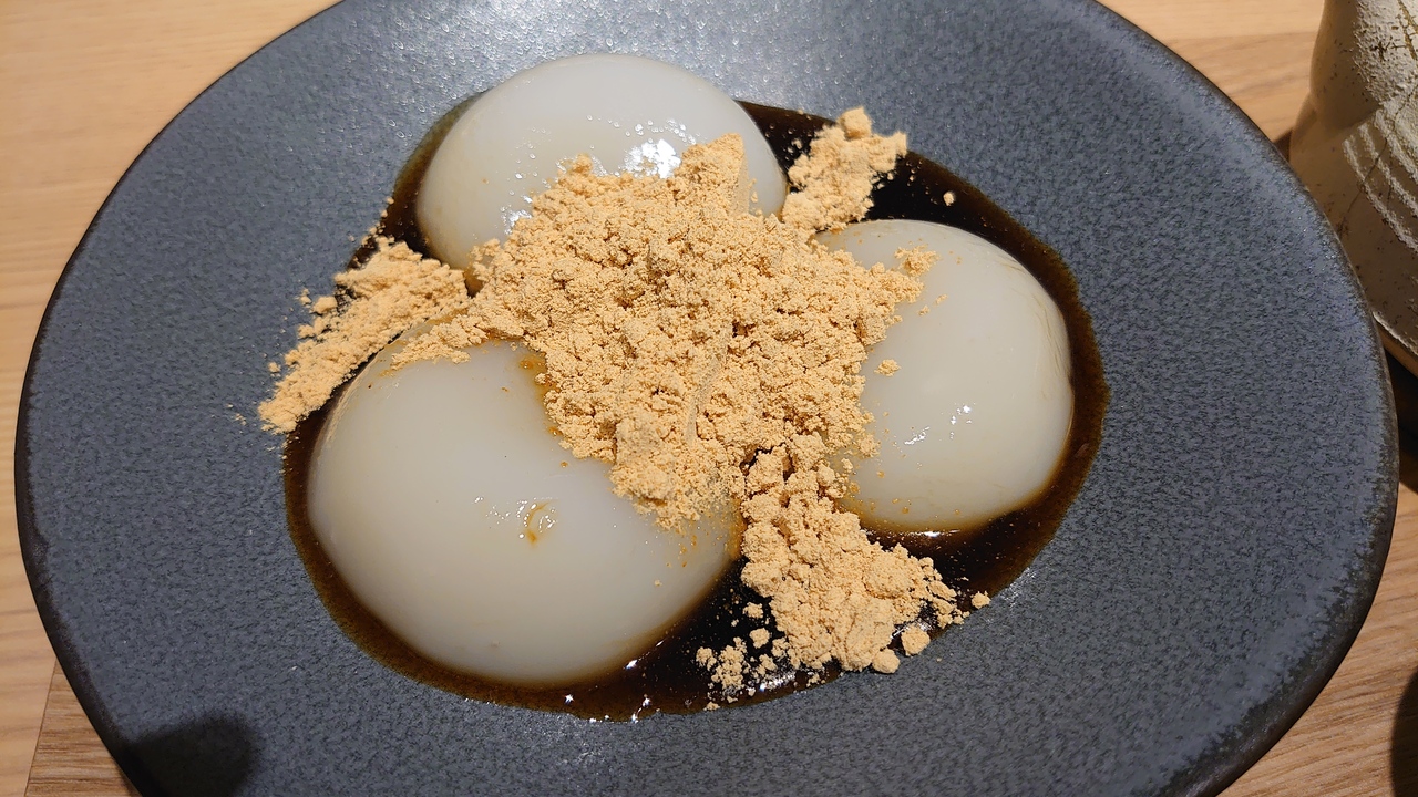 ぷるぷるのみずくずもちにきなこと黒蜜がかかっていて、とてもおいしかったです。