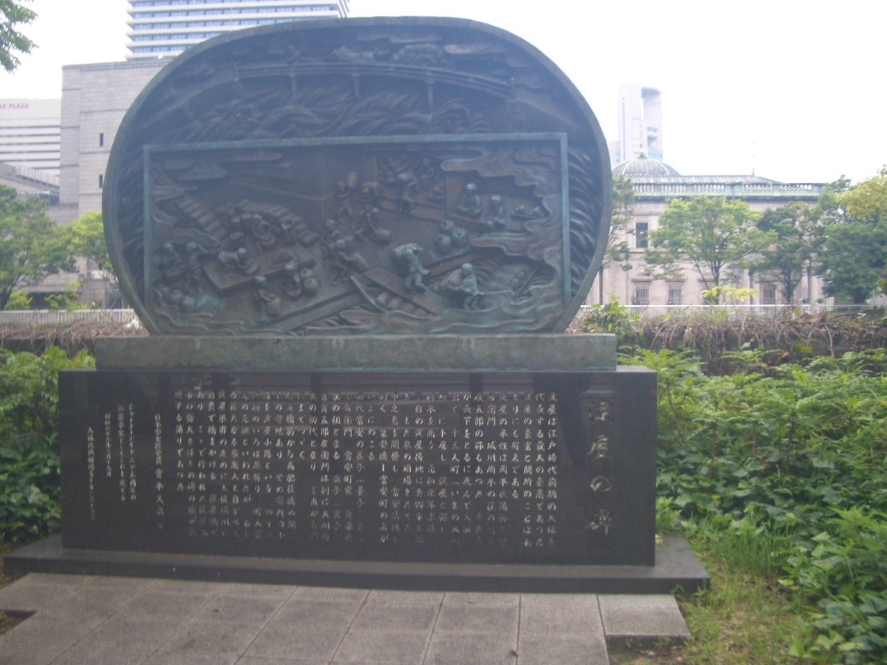 淀屋の屋敷跡は、土佐堀川の南側、淀屋橋の近くに、石碑とレリーフ(説明書き付き)があります。淀屋は、江戸時代の大坂の豪商です。全国の米相場の基準となる米市を設立、大阪が天下の台所と呼ばれる商都へと発展することに貢献したとのことです。淀屋橋は、淀屋が架けた橋とのことです。すごい財力です。