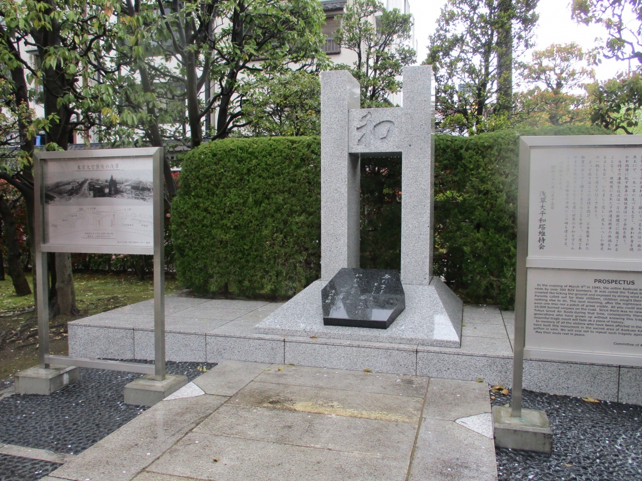 浅草寺の境内、淡島堂の近くにあります。昭和20年3月の東京大空襲で亡くなった多くの方々を悼むとともに平和を願い作られた塔です。モダンなデザインです。上部の石版に和の文字が刻まれています。台座に湯川秀樹の平和を祈る文字が刻まれています。