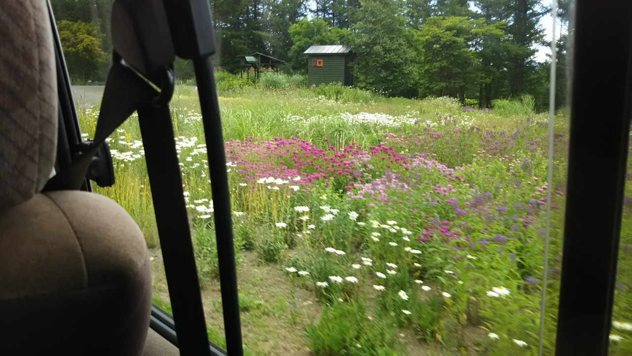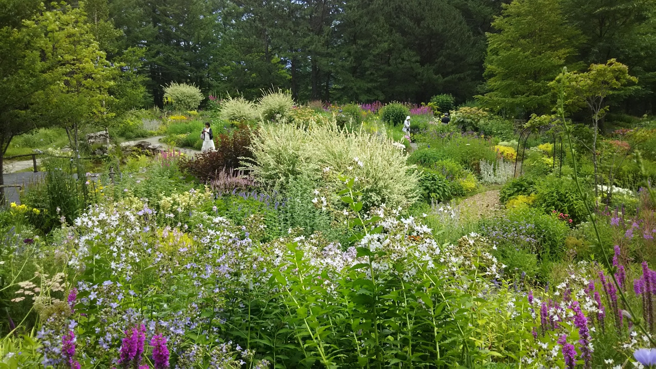 プリンスホテルからは送迎の車に乗り、数分走ると「風のガーデン」の看板が見え入口となっている。入ってすぐに花や植物が広がり、青い空の下で物語の別世界へ来たような雰囲気を味わえる。ガーデンは上野ファームのデザインだが、植物のバランスがとても良い。花の色、高さ、種類などがバランスよく組み合わされ、ジッと眺めていても飽きることがない。