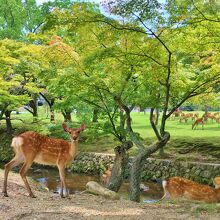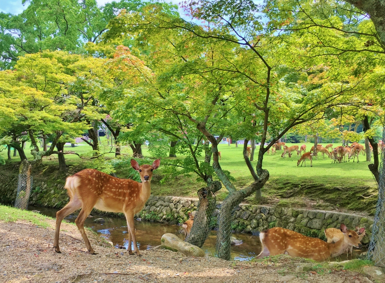 春日大社・興福寺・東大寺などの境内敷地に作られた、県立の都市公園である奈良公園を中心に鹿が暮らしています。1957年に奈良市一円の鹿が、「奈良のシカ」として国の天然記念物に指定されました。奈良公園内では鹿せんべいを販売する売店も多く見かけ、観光客に人気のイベントとなっています。奈良公園周辺を歩いていると、多くの鹿に出会います。とても可愛くて見ているだけでも癒されます。