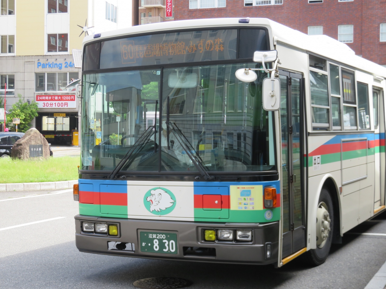 草津駅から琵琶湖博物館まで25分位のなかなかのバス長旅です。車両は西武系の近江鉄道バスですが、とにかく琵琶湖畔まで連れて行ってくれるので文句は言えません。途中から穂の実る麦畑と水を張った田んぼの間の農道を走っていくのが新鮮で美しかったです。