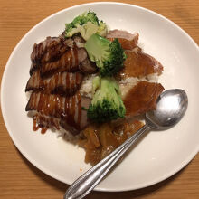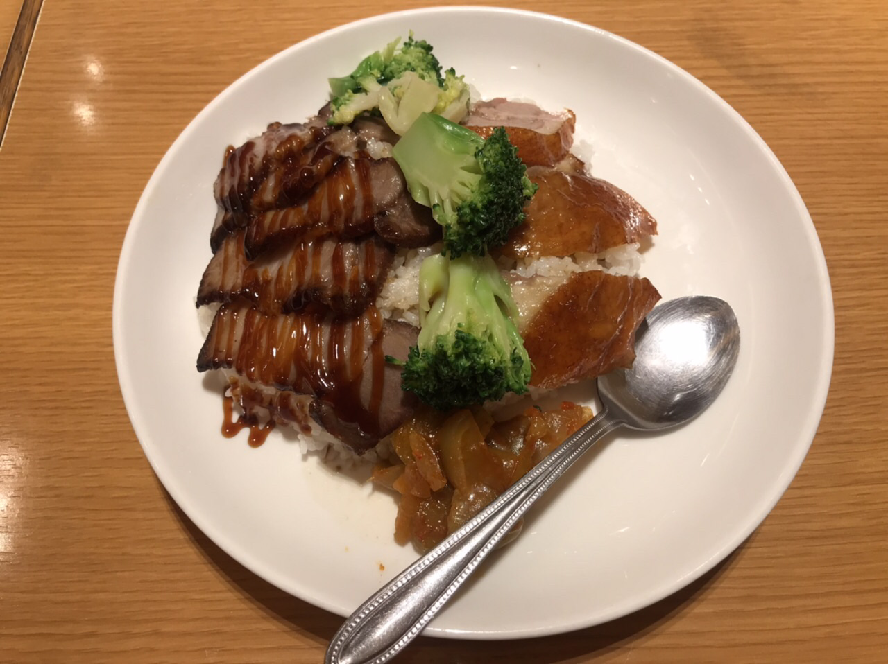 横浜中華街にある北京ダックのお店です。一人で夕食を摂りました。北京ダックと焼豚乗せご飯(890円)をいただきます。かなり適当な感じの料理で、ご飯の上に北京ダックと焼豚が乗り、真ん中をブロッコリーで分けています。これにダックスープも付きますが、ちょっと割高かなぁ。