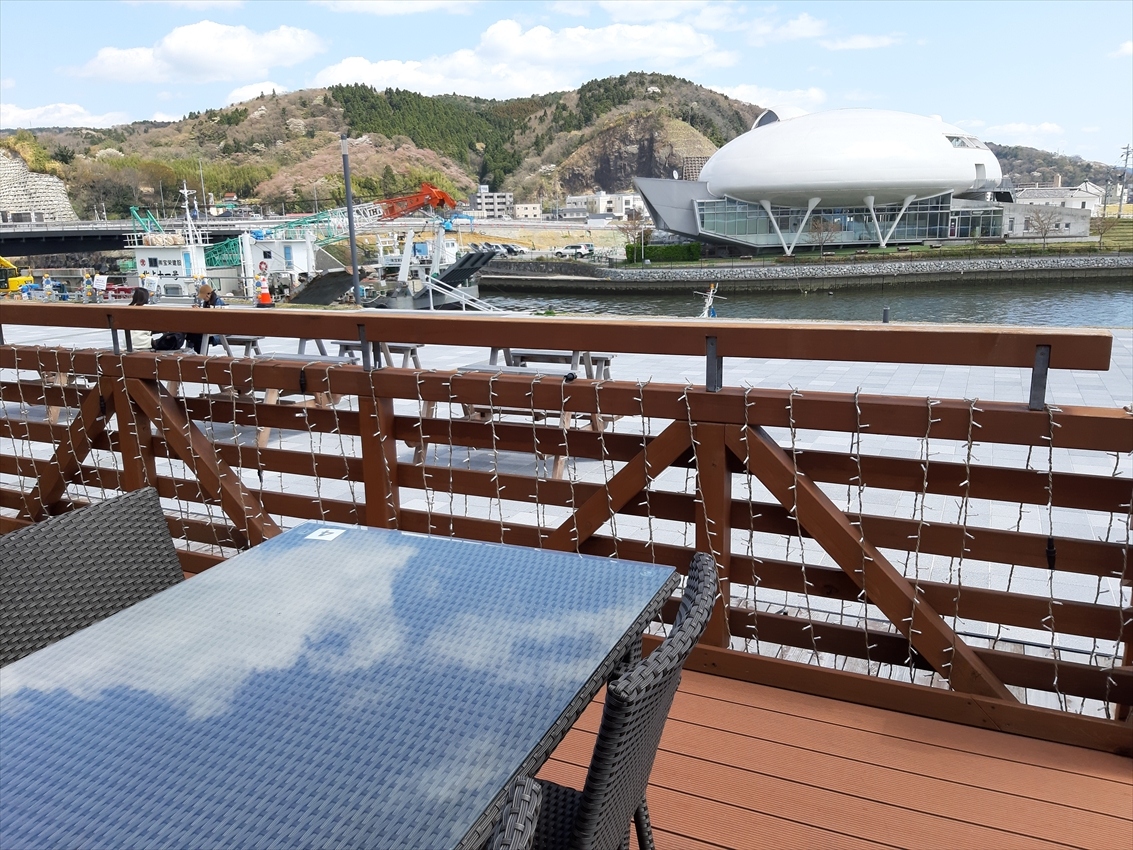 テラス席からは旧北上川を隔てた所にある石ノ森萬画館や周辺の景色が楽しめていい雰囲気。
