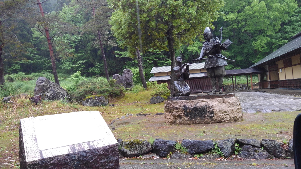 福井県九頭竜湖駅の駅裏あたりにあります。平安末期、平治の乱に破れた源義平はこの地に落ち延び村長の娘「おみつ」と恋に落ちたのですが、父の死を機に京へ上ることを決意し、自分の子を宿したおみつに一本の横笛を遺したと言う伝説があります。この「青葉の笛」のレプリカや篠笛,能管,竜笛や土笛などの笛が展示されているそうですが、あいにくの休館でした。資料館前にある像が印象的でした。