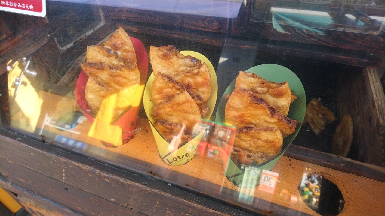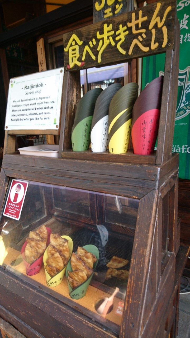 松本市のなわて通りを散策して見つけたせんべい屋さんです。店構えが良いです。おいしそうなせんべいが店先に並んでいて、素通りができません。中に入るとさらに多くのせんべいがあり、選ぶのに迷います。結局、醤油味とザラメ、唐辛子の3種類を買いました。せんべいを食べながらなわて通りを歩きます。