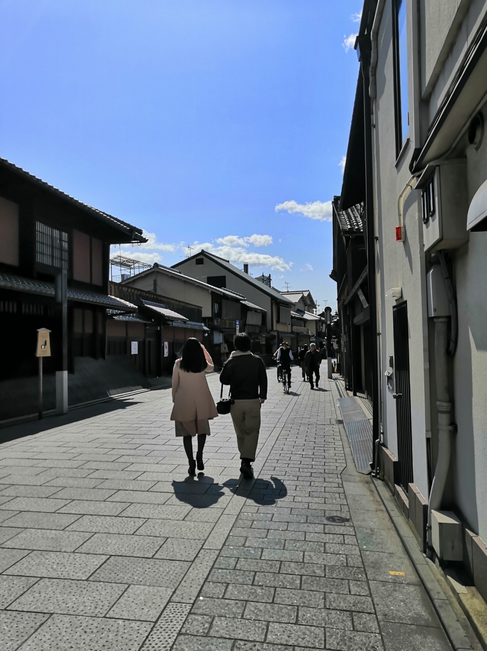 八坂神社に近い京都らしい町並みの通りです。京町家が並んでいます。舞子さんでも歩いていればより雰囲気いいのでしょうが、週末はずぐ近くに馬券売り場があるせいか、オジサン率が高めで残念。脇道に入ると私道が多くて、「撮影禁止」と書いてあるところも多いので気を付けて。