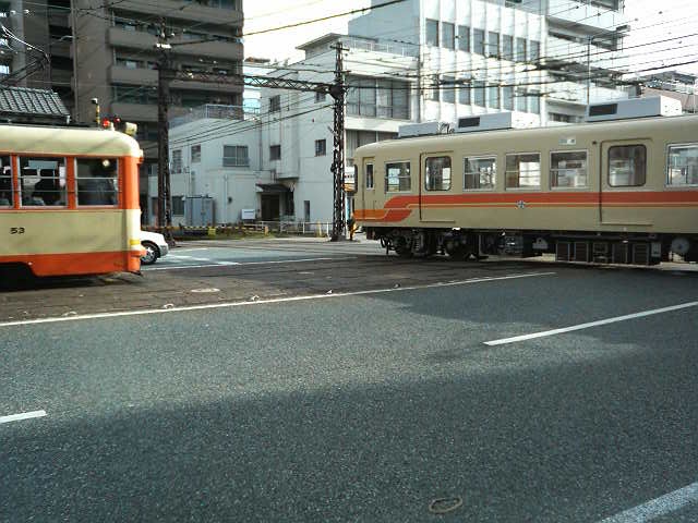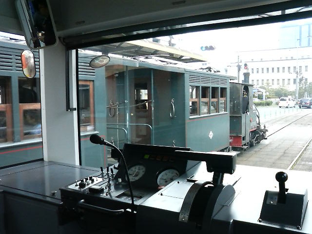 また、路面電車自体が昔ながらの雰囲気ですが、結構な頻度で同じ線路を通るSLっぽい坊っちゃん列車とすれ違ったりとレトロな車窓が撮れたりするので目が離せません。