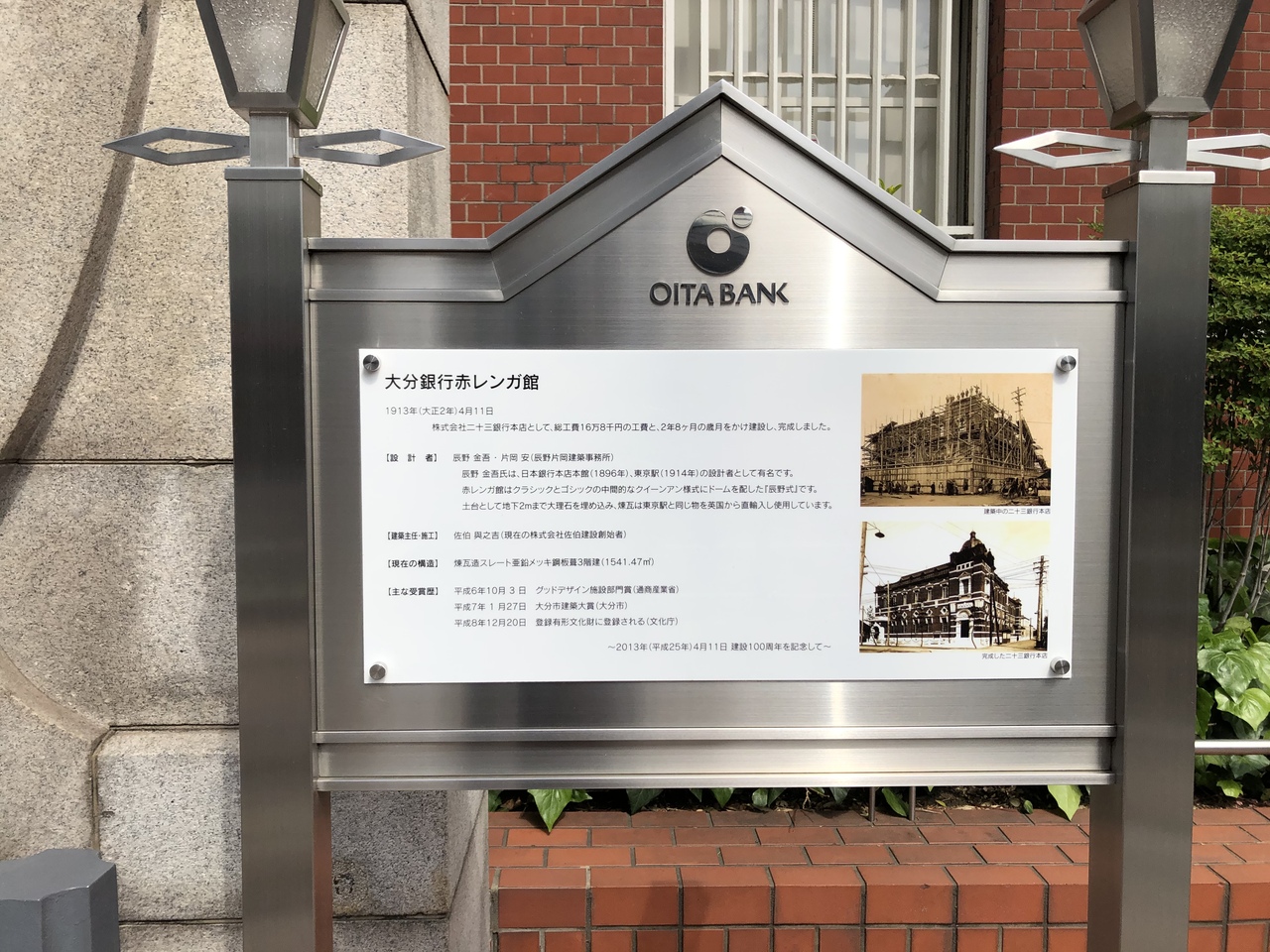JR大分駅よりすぐ、トキハ本店の隣にある建物で、1913年、大正2年に、大分銀行の前身であり、大分県初の銀行でえる第二十三国立銀行の本店として建設されたもの。東京駅や日本銀行本店(現、日銀旧館)などを手掛けた辰野金吾氏に設計で、国の有形文化財にも使用されているルネサンス様式の建物。1949年、昭和20年7月、戦災により周囲のレンガ壁を残して消失されましてが、1949年4月、再建され、1966年までは本店として使用されていました。本店移転後は、ローンプラザなどとして利用されていましたが、現在は全自動貸金庫やATMコーナー等を設置した建物として活用。2020年3月にリニューアルされ、外観、内装共に一新。館内は、建設当初の赤レンガを内装に使用し、コンクリートの柱、化粧梁を戦後再現時に建てられたものに修復、さらに銀行の営業時間分しかない大理石の時計を展示するなど復元されています。駅から近いので、時間潰しに見学することも良いかも。