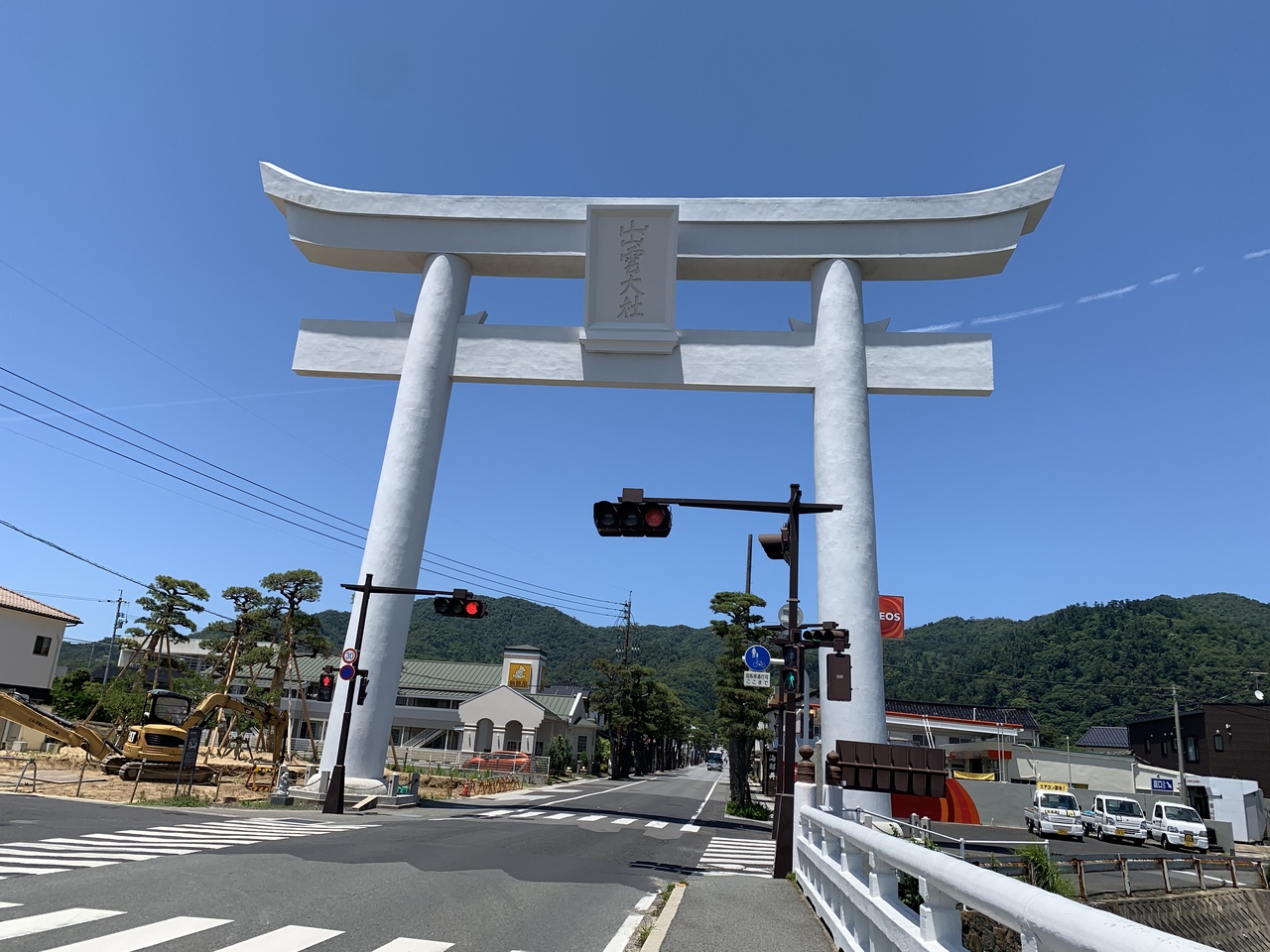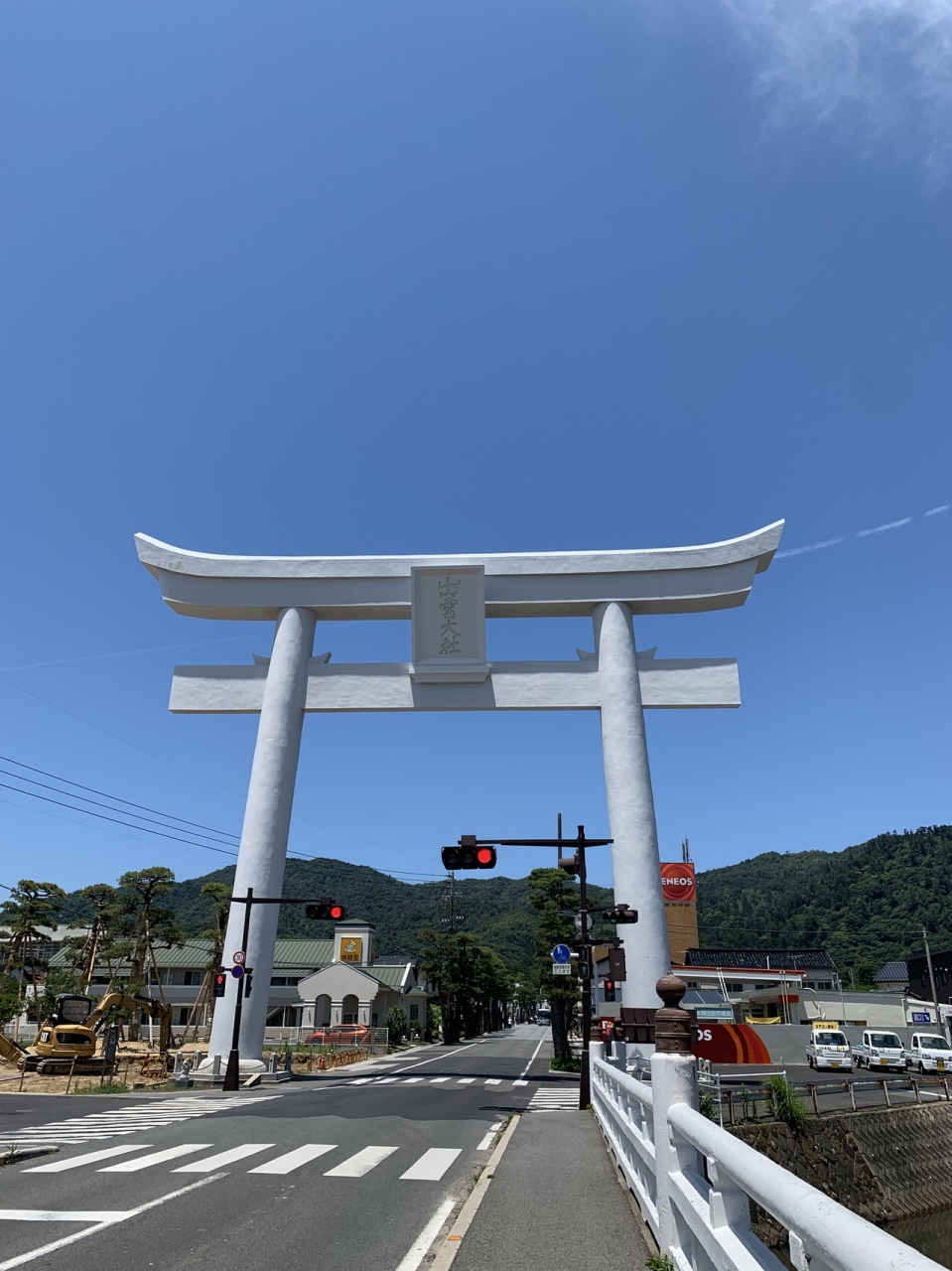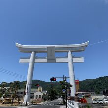 正式名称は出雲大社宇迦橋大鳥居といいます。大鳥居のすぐ前にかかっている橋が宇迦橋で、宇迦山にちなんでつけられたそうです。鳥居は大正天皇即位を記念して造られました。今は国の登録有形文化財に指定されています。