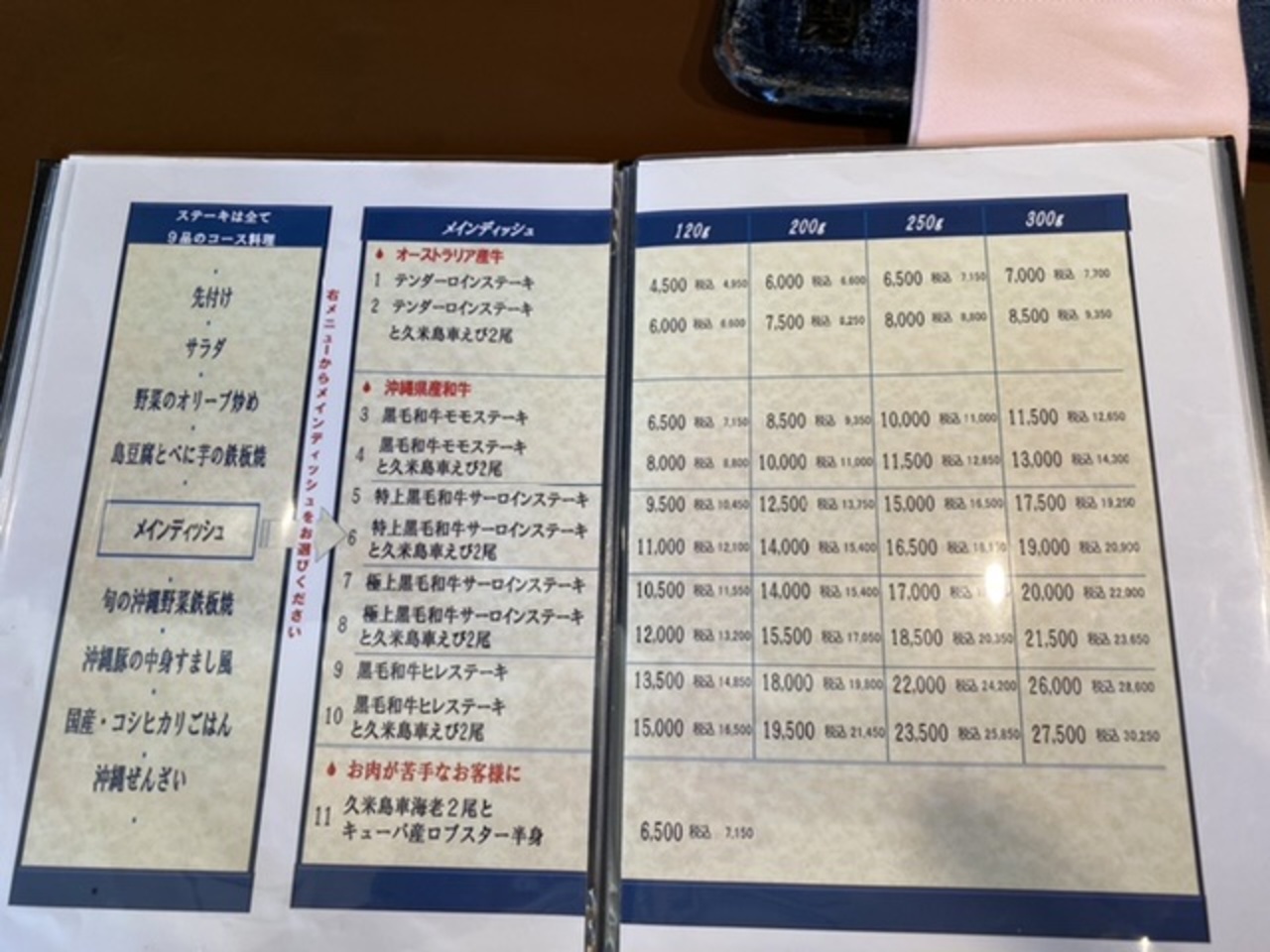 たのんだのはオーストラリア産テンダーロインステーキ120gのコース4,500円。飲み物はノンアルコールビール。