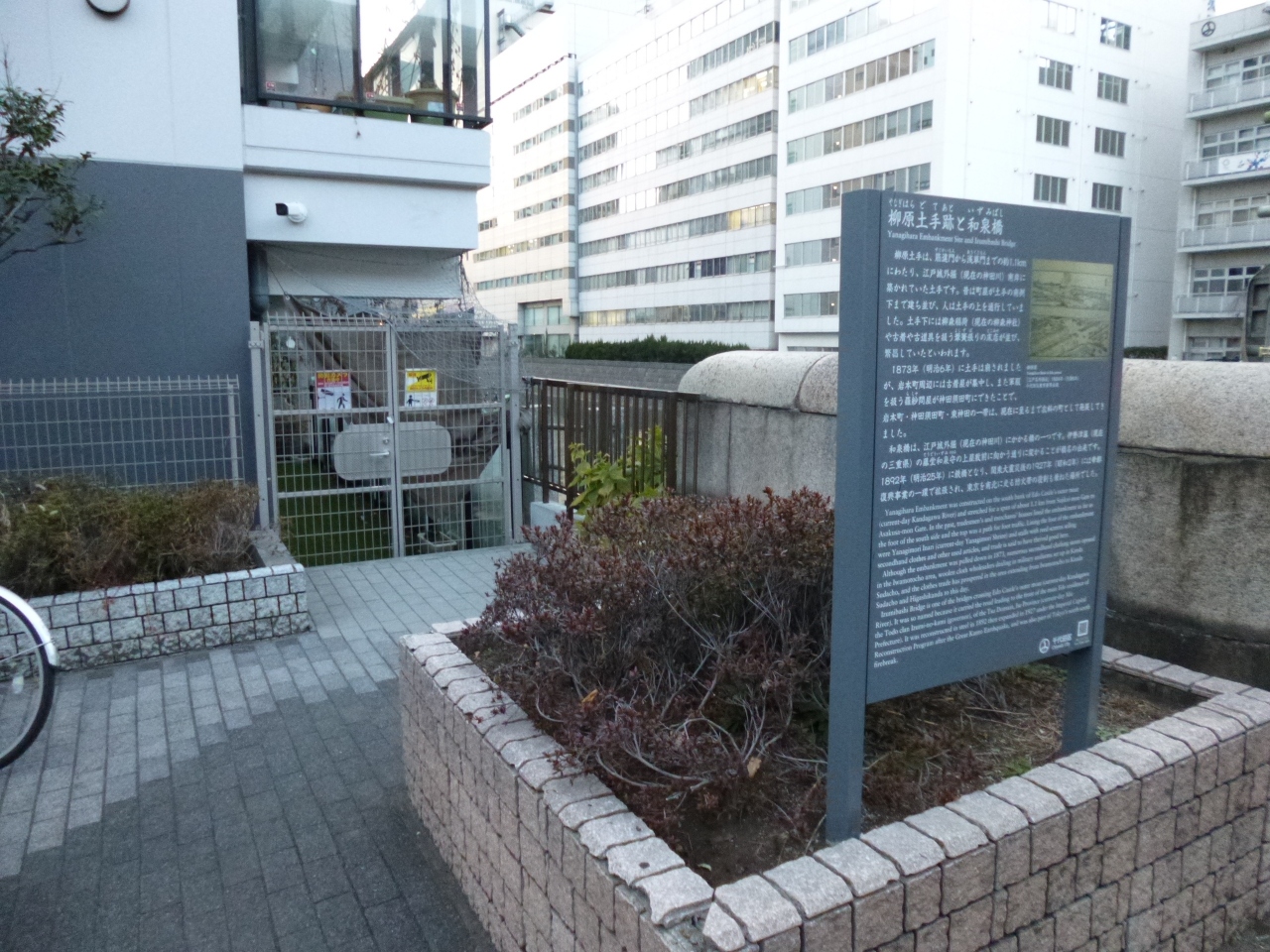岩本町駅の近く、和泉橋のたもとに案内板が立っています。江戸時代、この橋のあたりにさらに隅田川にかけて、神田川沿いの南側に柳原土手という土手が築かれていたそうです。太田道灌が江戸城の鬼門除けに柳を植えたことに由来するそうです。その後、明暦の大火で柳の木が燃えてしまったそうですがに8代将軍吉宗の命により土手に柳が植えられ、江戸の名所となったそうです。
