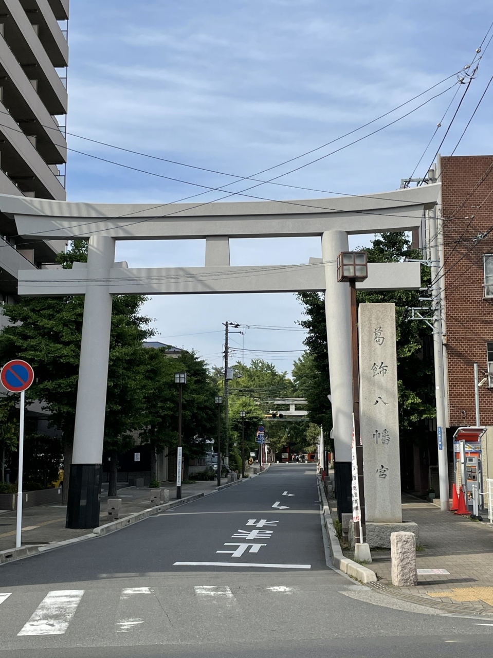 本八幡の市役所の近くにあります。14号と京成の線路を渡ってすぐのところに石の鳥居があります。源頼朝や太田道灌などが参詣しているそうです。地元の子供達が遊ぶ児童遊園や全日警ホールなどもすぐちかくにあります。賑やかなところにあるのですが、静かな空間になっています。