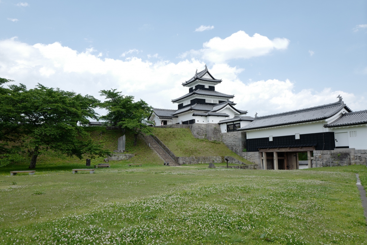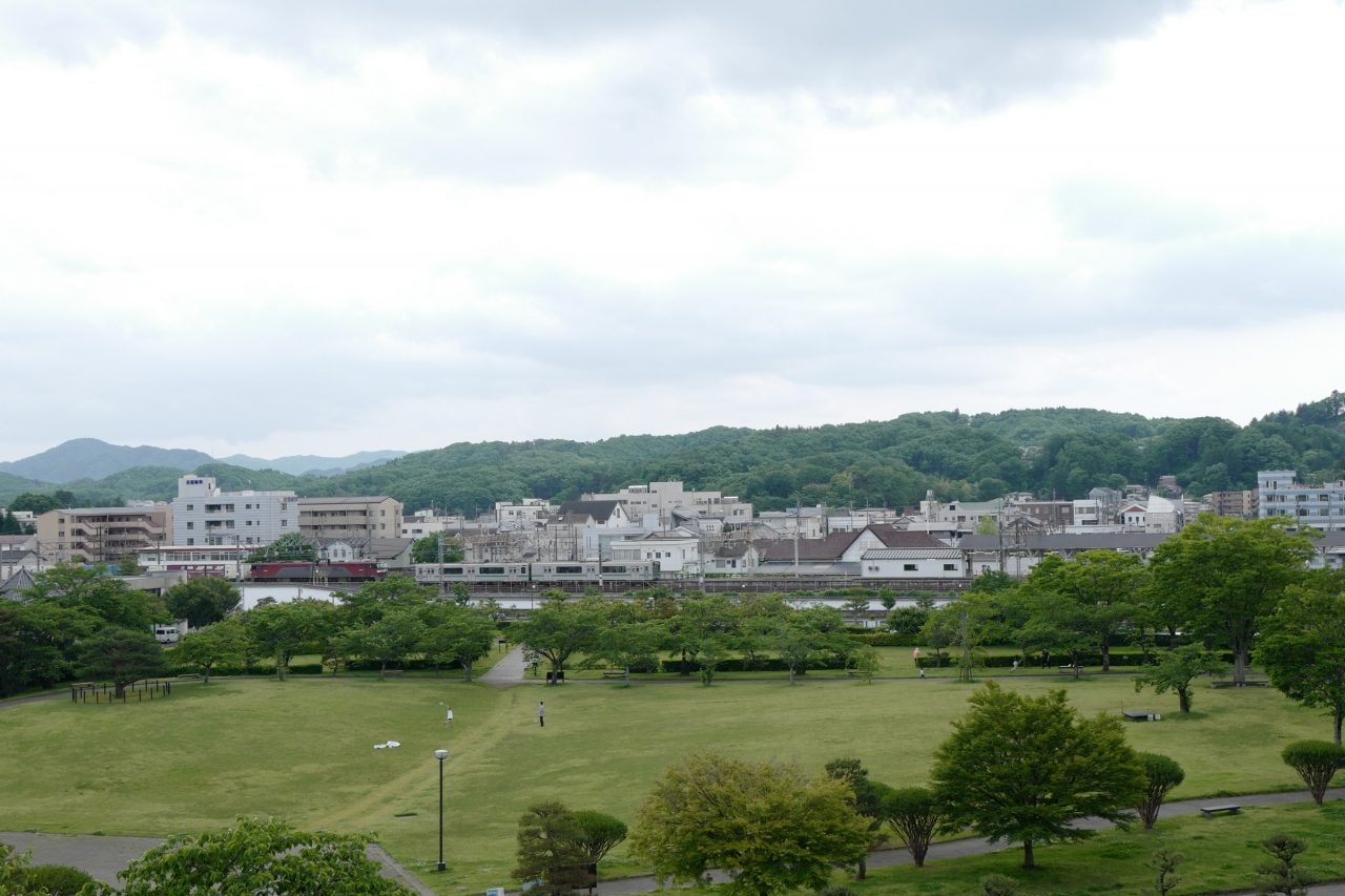 那須からレンタカーを使って訪問。白河駅のすぐ裏手にあり、ホームからも城の姿がよく見えます。駐車場も多数あるし、アクセスは文句無しです。城入口のエリアは芝生敷きの公園になっていて、遊び場やピクニックスポットとしても重宝します。