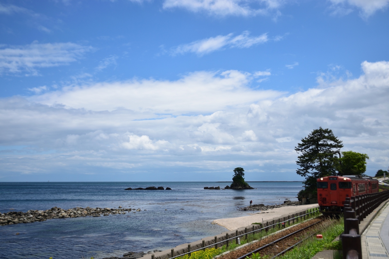 富山県の富山湾を望む絶景スポットが雨晴海岸です。富山から車で時間程度と手軽に行く事ができます。向かいには道の駅があり、車はその駐車場に停めて観光します。線路を渡り海岸に階段で降りていきます。富山湾を望む絶景を間近に楽しめます。