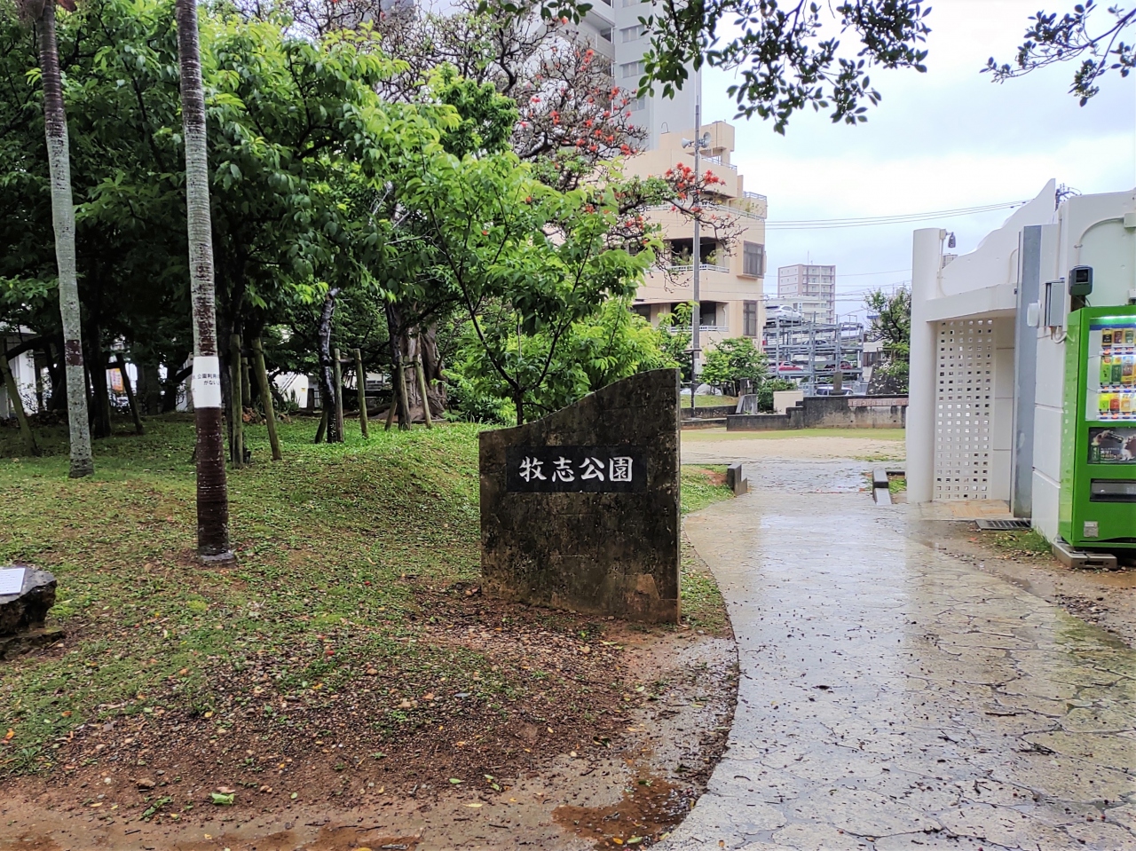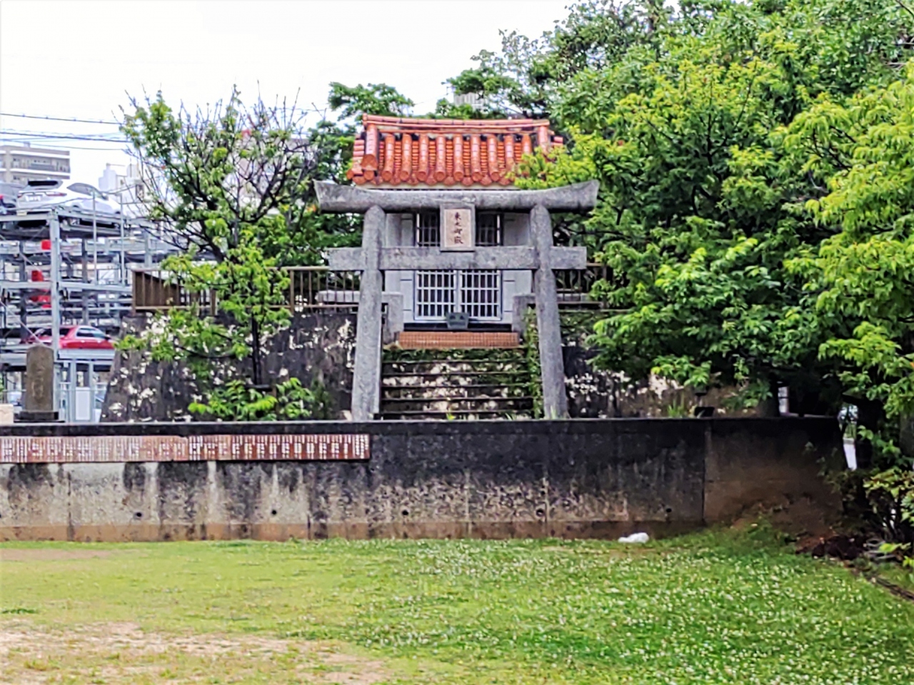 ゆいレール・牧志駅を降りてすぐ前、交差点を渡った先に公園があります。公園案内板の先にはきれいなトイレに自販機、その先に少しの広場、更にその奥には何かの神社のような鳥居と社が見えます(東之御嶽)。交差点側の入口のベンチは木陰のため、暑さ覚しの休憩で利用してます。