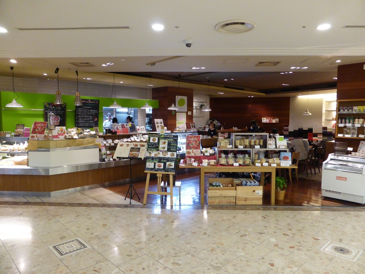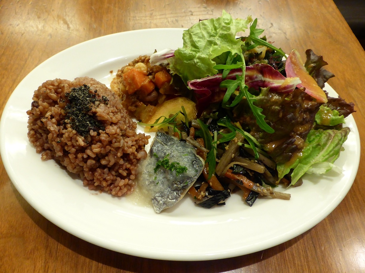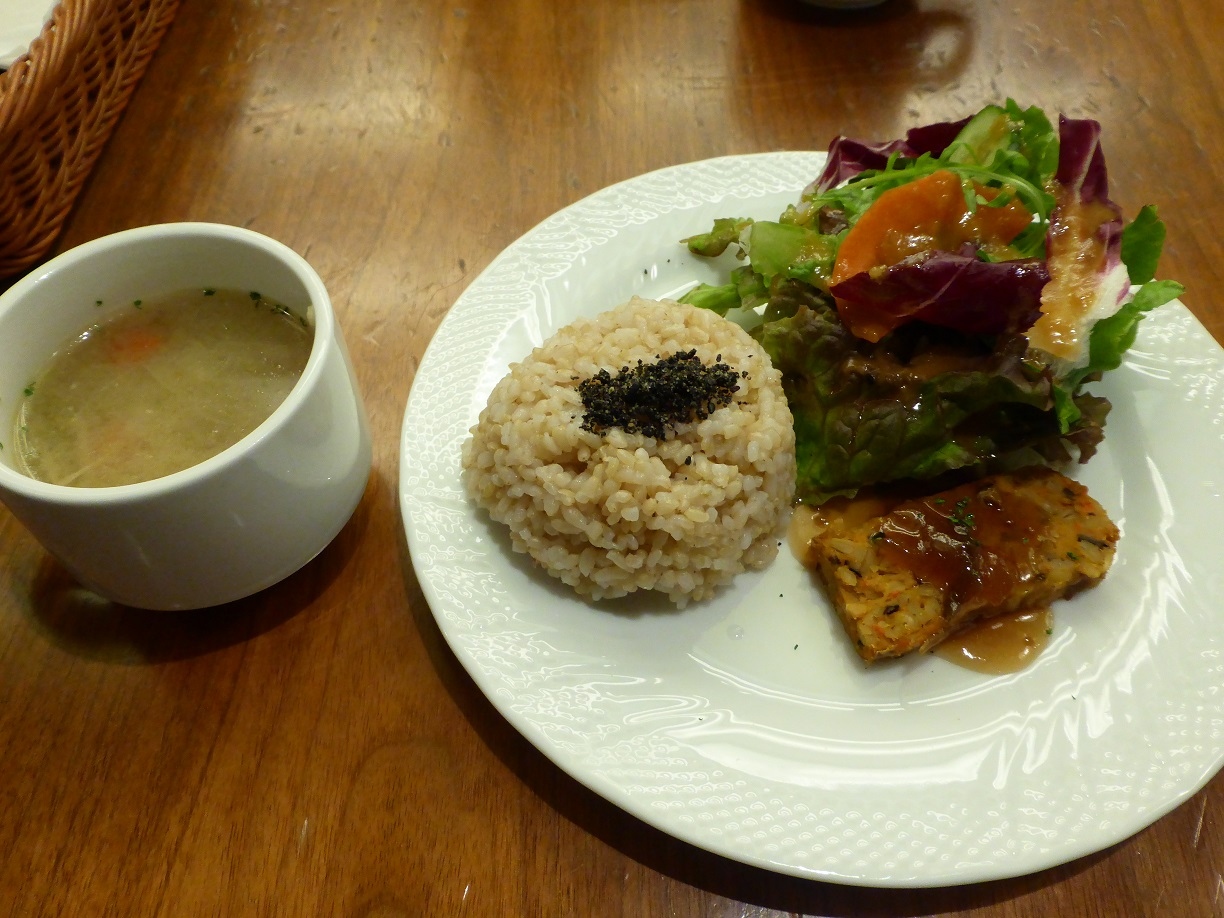プチランチのメインデリはベジミートローフで、サラダ、有機玄米ご飯、スープがセット。ベジミートローフは所謂大豆たんぱくだけではなく、いくつかの野菜も混ざっているので味わいも複雑で歯ごたえもあり、物足りなさは感じませんでした。スープは野菜の甘みが良く出たやさしい味でおいしいです。フィッシュプレートの魚はイトヨリダイのソテー。これにアカメという海藻と牛蒡人参の金平、ひよこ豆の煮込み、サラダ、酵素玄米、スープです。イトヨリダイはソースとのバランスも良く、アカメは黒く薄いもので、噛んでいると確かに海藻の味わいがします。ひよこ豆は歯ごたえもあり食感も楽しめます。酵素玄米は初めて食べましたが、もちもち感があり滋味深いです。
