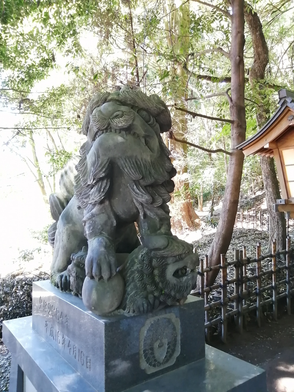 高千穂神社の鳥居をくぐると迎えてくれるのがこの狛犬です。毛がモクモクとしており、犬と言うよりは狗神様というか独特の神々しさがある姿をしています。また珍しいと思ったのは、狛犬がわるい神様か何かを踏みつけている点。さすが高千穂と思わせてくれる狛犬でした。