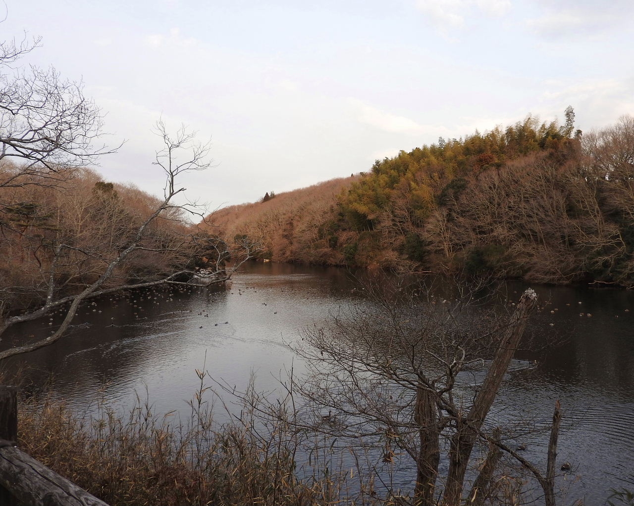大膳池の周囲には、オシドリの好物のドングリがなるコナラの林が多いので、毎年、多くのオシドリが越冬しにやってきます。