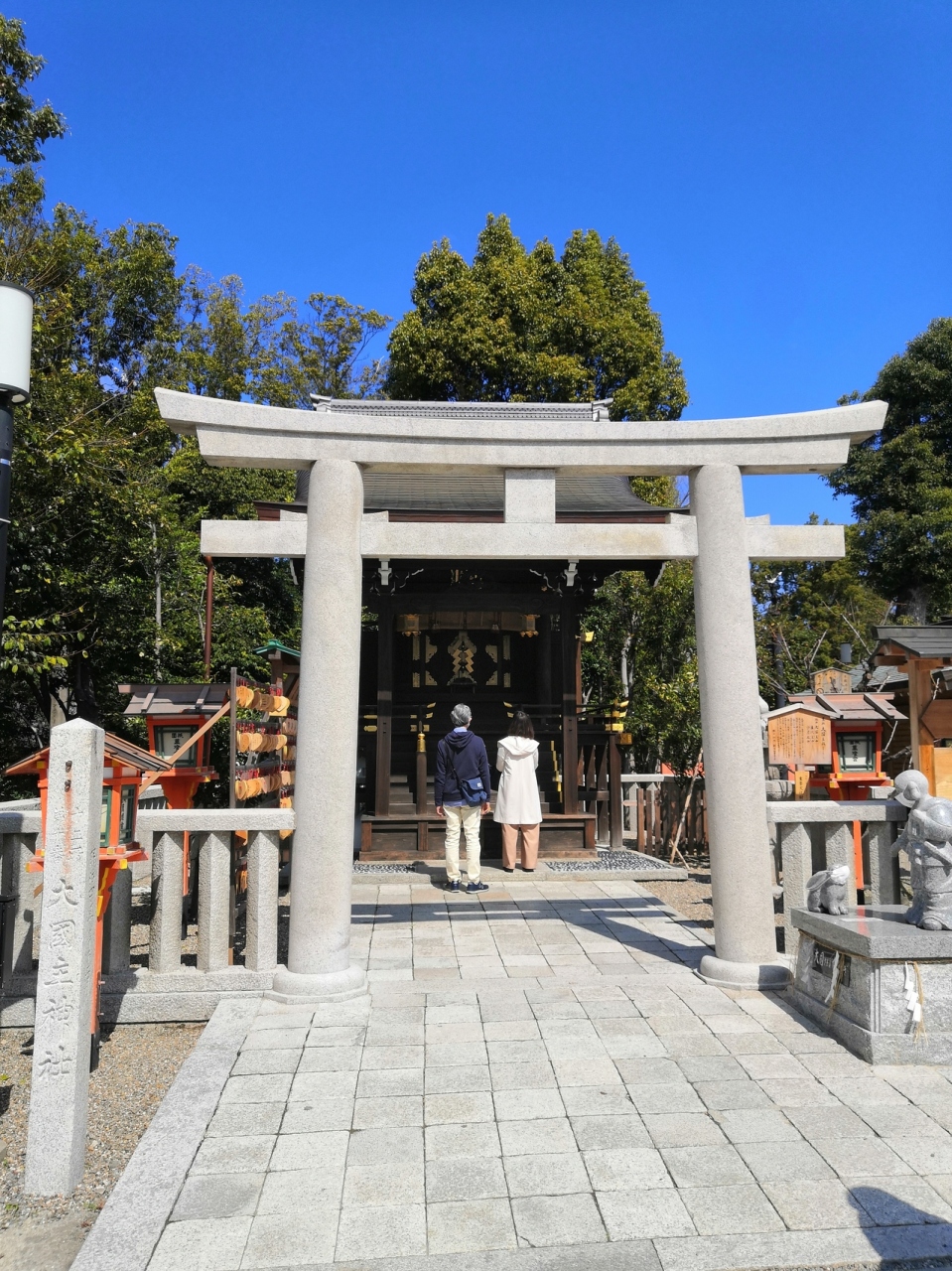八坂神社の末社の一つです。福の神、縁結びの神として知られている大国主命(おおくにぬしのみこと)を祀る神社です。因幡の白兎」(いなばのしろうさぎ)で有名ですよね。さすがにどこでも縁結びは人気で、やや人は多かったです。