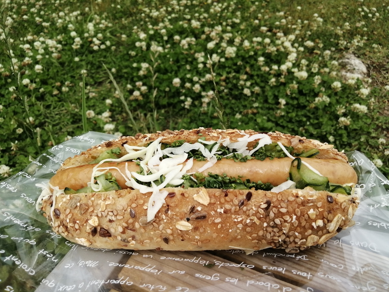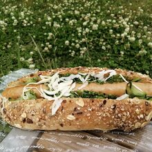 お味は…うまいです。ドレッシングのかかったキャベツ、きゅうりとパキパキのソーセージ。ピクルスを刻んだようなものと、スプラウト的なものも添えられていました。パンにもゴマやらナッツやらがくっついていてなかなかイケてます。しかーし、1個ではお腹がふくれない…。2個買えばそこそこいいお値段になってしまうのが難点かなと思います。