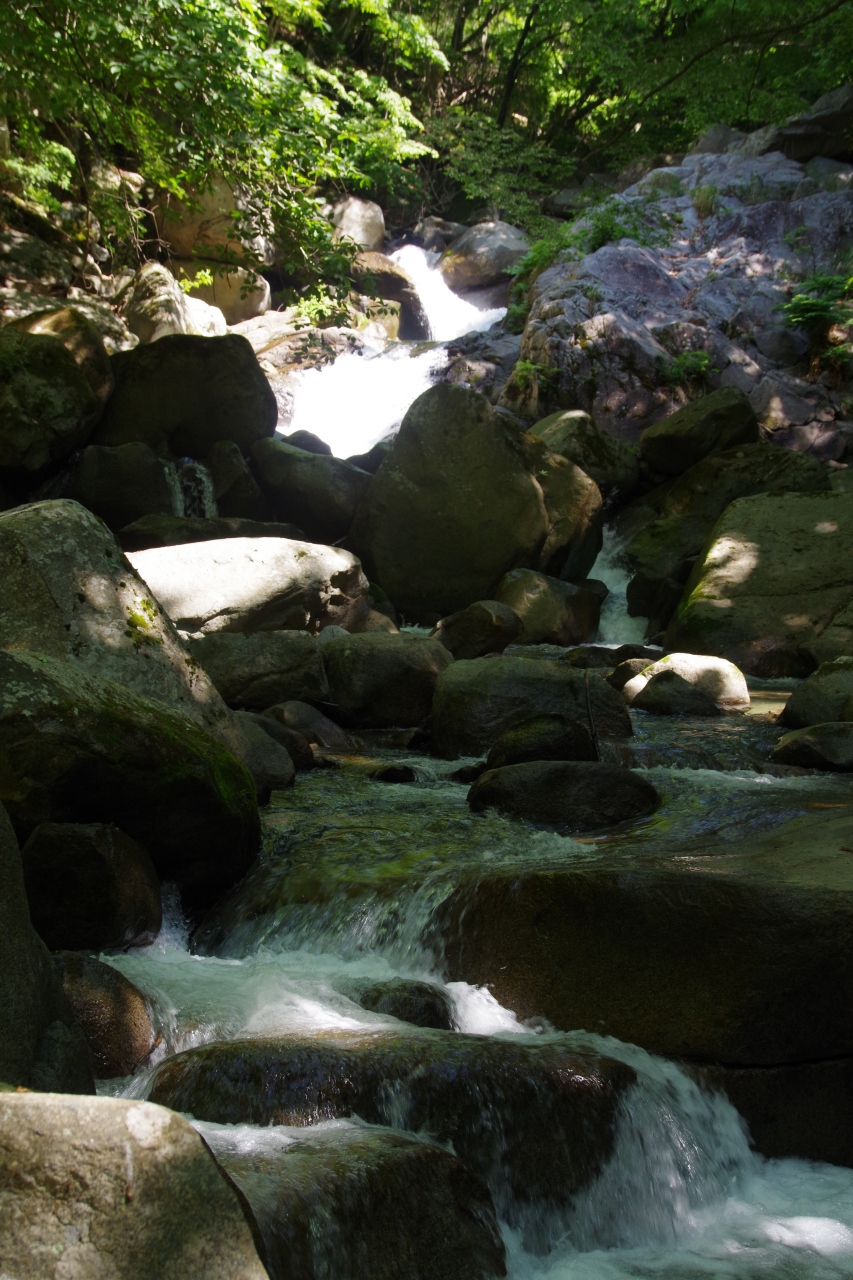 大きな橋が架かった竜門入口より「竜門峡遊歩道」に入りました。高い所から竜門の滝と思われるものが見えましたが、木が多くて、見づらかった。水力発電の施設が有りますが、立入禁止で、近寄れませんでした。「落合三つの滝」はどれかな。単に綺麗な渓谷美を愛でるのが良いです。