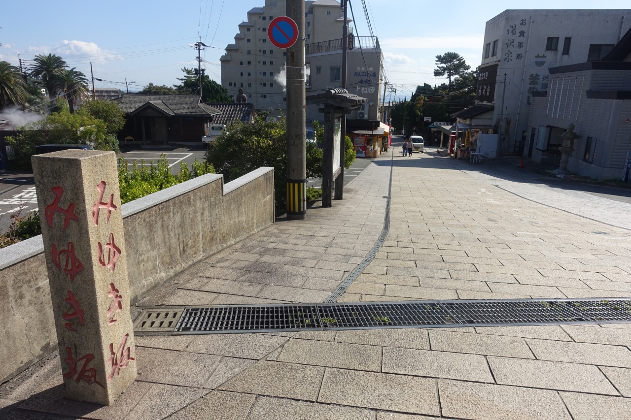 鉄輪温泉を東西に通る坂です。みゆき坂自体は250mほどしかありませんが、亀の井バスの乗り場がある信号からそのまま下り方向はいでゆ坂へと繋がっています。みゆき坂~いでゆ坂で一つの通りといった感じで、これが鉄輪温泉のメインストリート的な存在でしょうか。