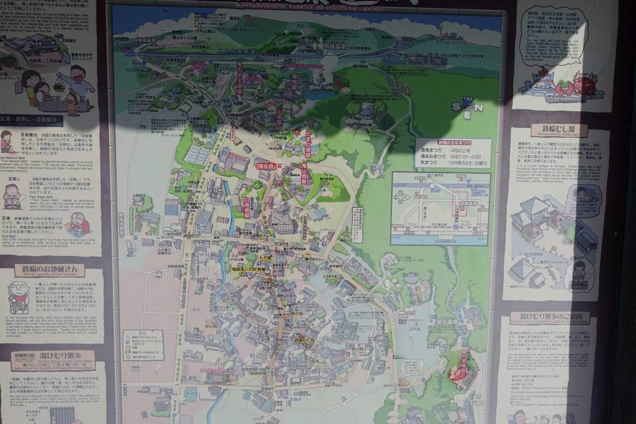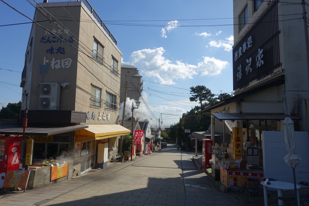 沿道にはホテル、飲食店、土産物店、それから鬼山地獄と白池地獄があります。平日だったせいか人は少なめで賑わいはあまりなくて寂しかったかな。でも石畳になっているのでそれなりに風情が感じられたのは良かったです。