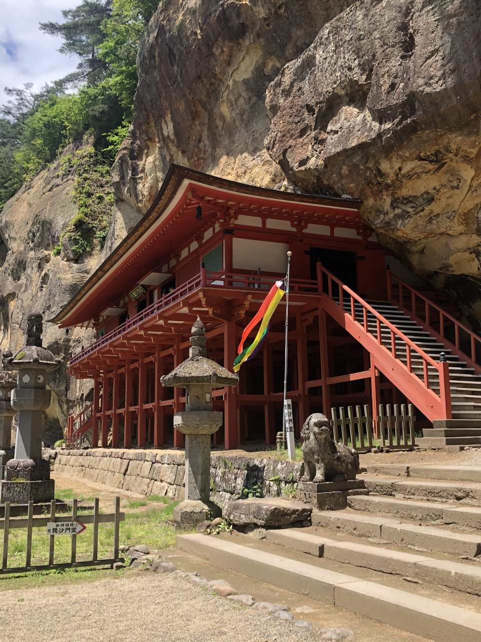 以前平泉を訪れた時にはとても徒歩やバスで行けるところではなく断念したが、今回車で達谷窟毘沙門堂を訪れた。平泉からは約6㎞の距離。2011年に平泉の建築、庭園と共に世界遺産に登録されている。達谷西光寺の名を持つが、入り口には鳥居があり驚かされる。神仏混淆の社寺の典型で入場料は400円。アジア各国で類似の仏教建築を見てきたが、日本では稀にみる素晴らしい岩屋懸造建築だ。