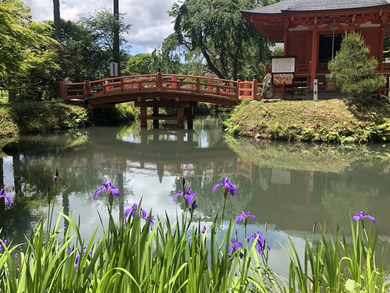 創建は801年、征夷大将軍であった坂上田村麻呂が、ここを拠点としていた悪路王を討伐した記念として建てた。何度も火災により焼失、1615年には伊達政宗により再建。現在の建物は1961年に再建されたものだ。また西側の岸壁上部には大日如来(阿弥陀如来)の大きな磨崖仏が刻まれている。