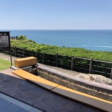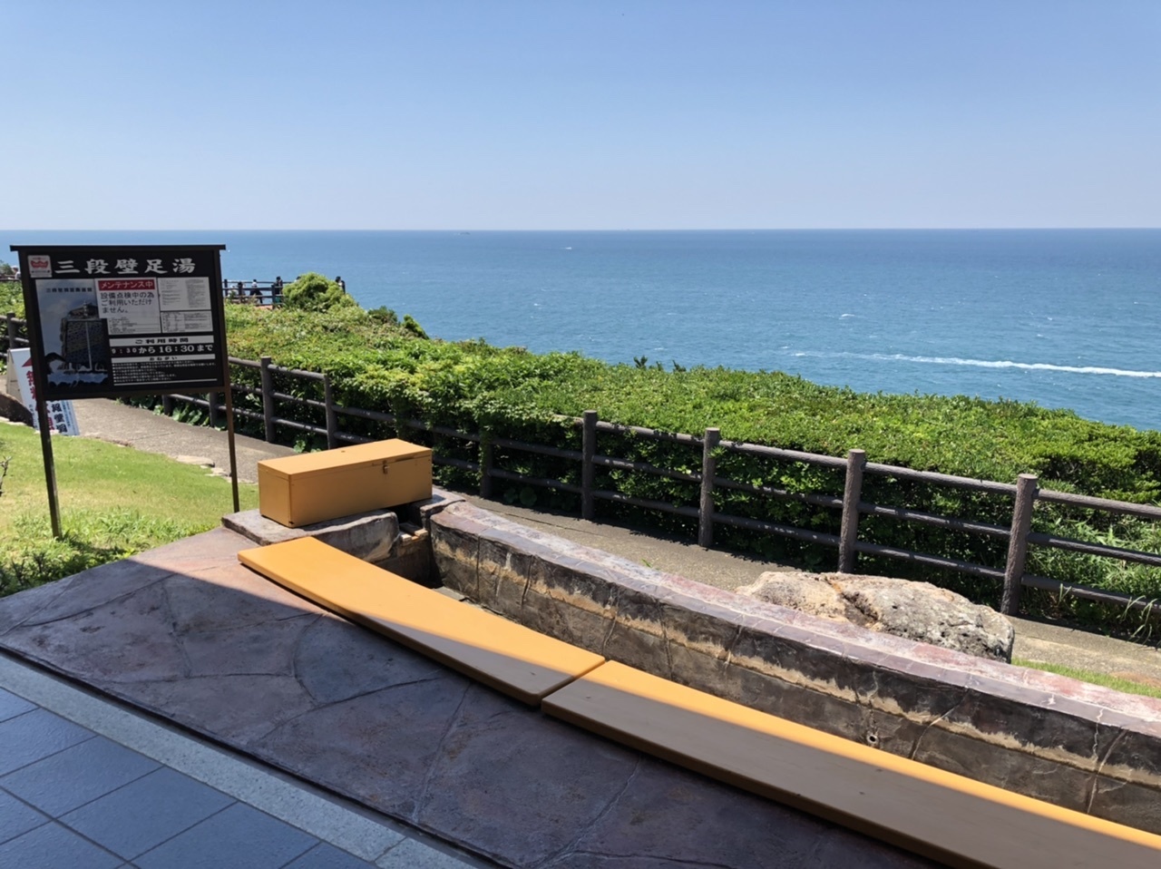 エレベーターで下に降りる施設の外側には、無料で使える足湯があって、海を見ながら休憩できるようになっているのですが、コロナのご時世なのでお湯ははられていませんでした。