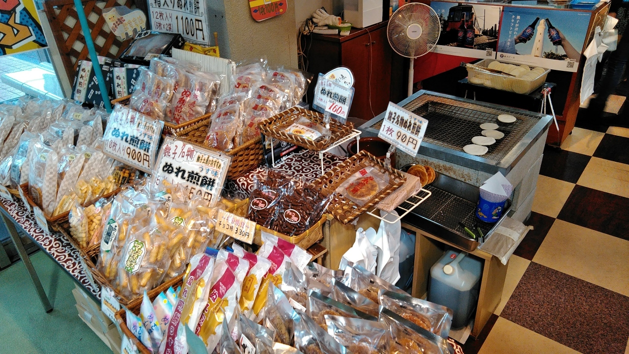 銚子電鉄で有名になった「ぬれせんべい」を店頭で焼いていて、焼きたてを購入できます。もちろんばら売りもしてくれるので、1枚90円で買って、早速食べました。