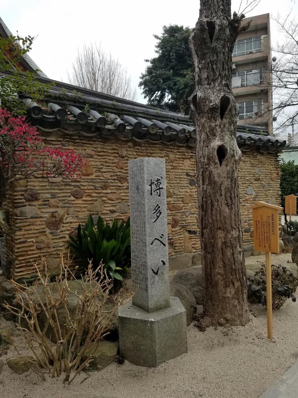博多べいは、豊臣秀吉が九州に進出し争ったときに焼け落ちた博多の街の瓦礫を使った塀で、400年以上の前のものが櫛田神社境内に残っています。商人たちが作り上げた復興のシンボル的存在で、現存するのは数少なく貴重な存在、歴史の重みと博多商人のたくましさを感じました。