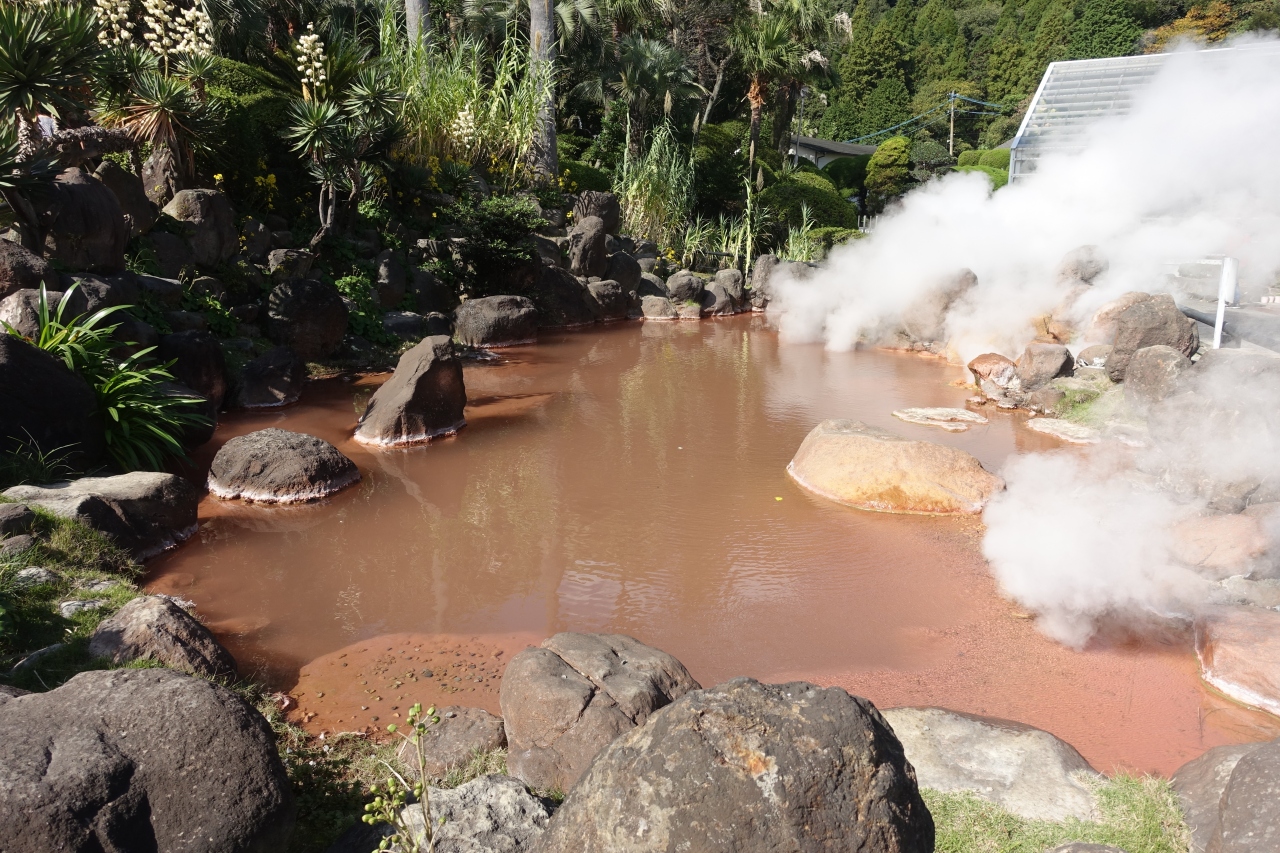 青い池を見たら終わりではなくて、園内にはほかに温室や足湯などもある点がいいです。足湯は薄っすら濁っていて、海地獄の源泉100%のお湯に浸かることができ、施設も新しめで快適でした。あと、海地獄と言えば青い池ですが、園内には小さめながらも赤い池もありました。真っ赤というよりは赤茶色って感じですが、海地獄に行くだけで青と赤と両方見れちゃいます。