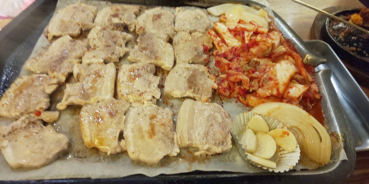 サムギョプサルは厚みはさほどないものの脂がのっており厚みがないぶんすぐ焼けるのが良かったです。(薄切りではないですよ)
