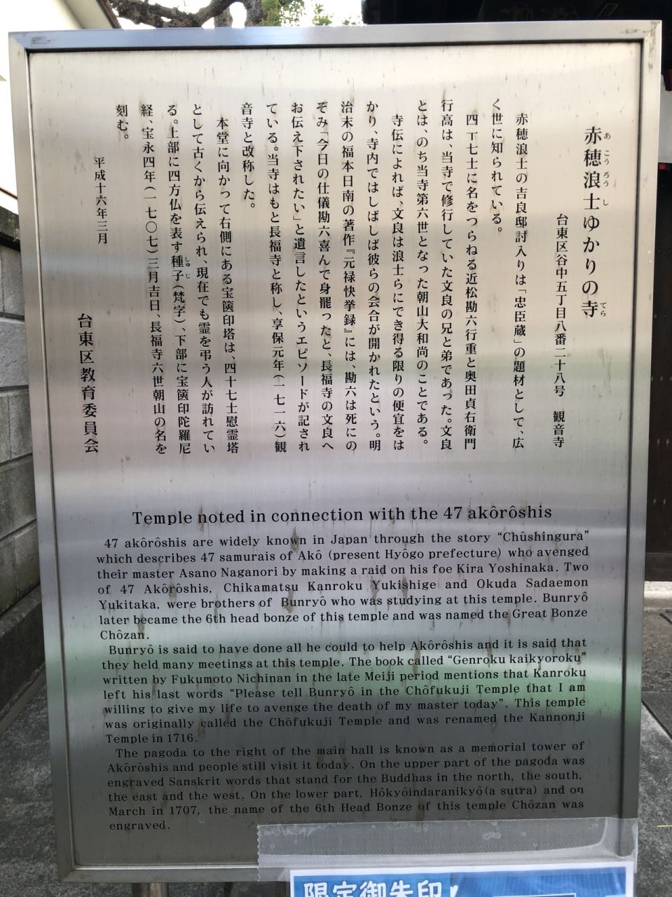 もともとは長福寺と呼ばれていたとのことで、このお寺の第六世の朝山大和尚の兄弟が赤穂浪士のうちの2人であったとのことです。境内には赤穂浪士を供養する塔がありました。脇には立て看板があるため解りやすいです。知らずに訪れたのですが、勉強になりました。