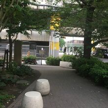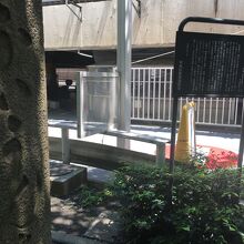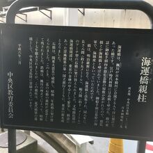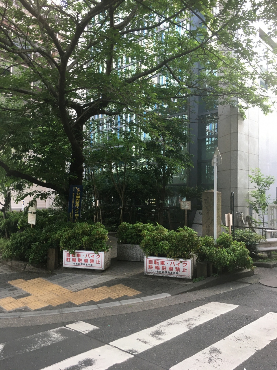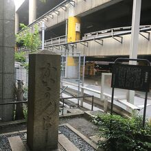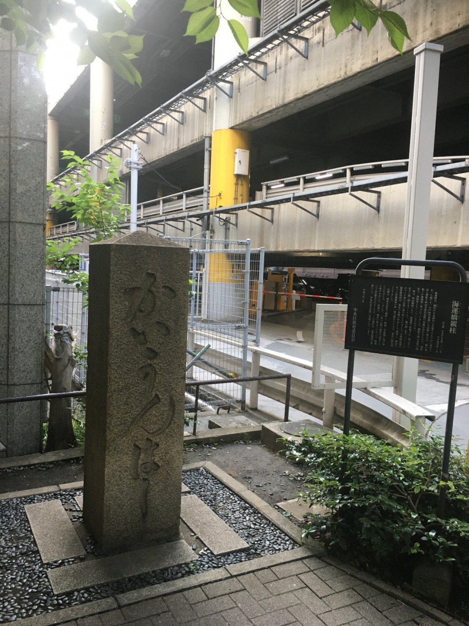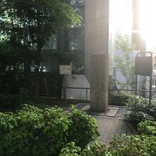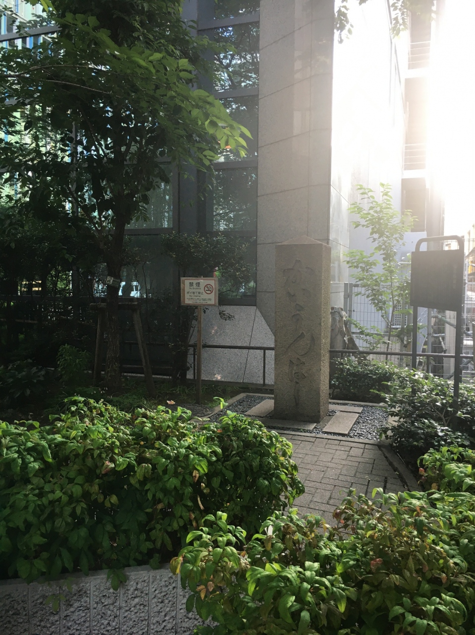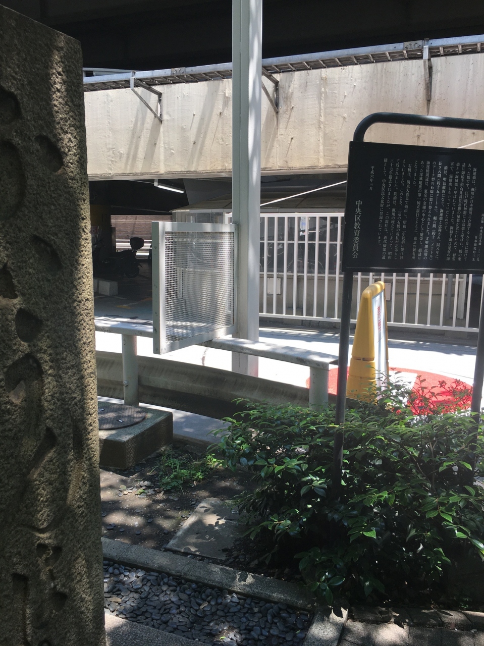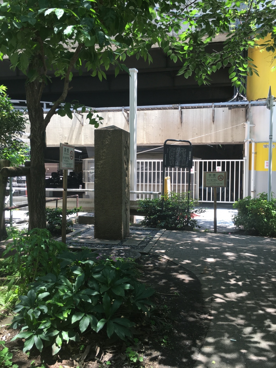 江戸時代には日本橋川の入江に架けてあった橋で、現在は隣に首都高速があり、ミニ公園のようになっていましたが、よく見ると橋の名残のようなものも感じました。木の下には縦型の長方形の石碑があり、裏通りにあるため少し休むには良い場所でした。