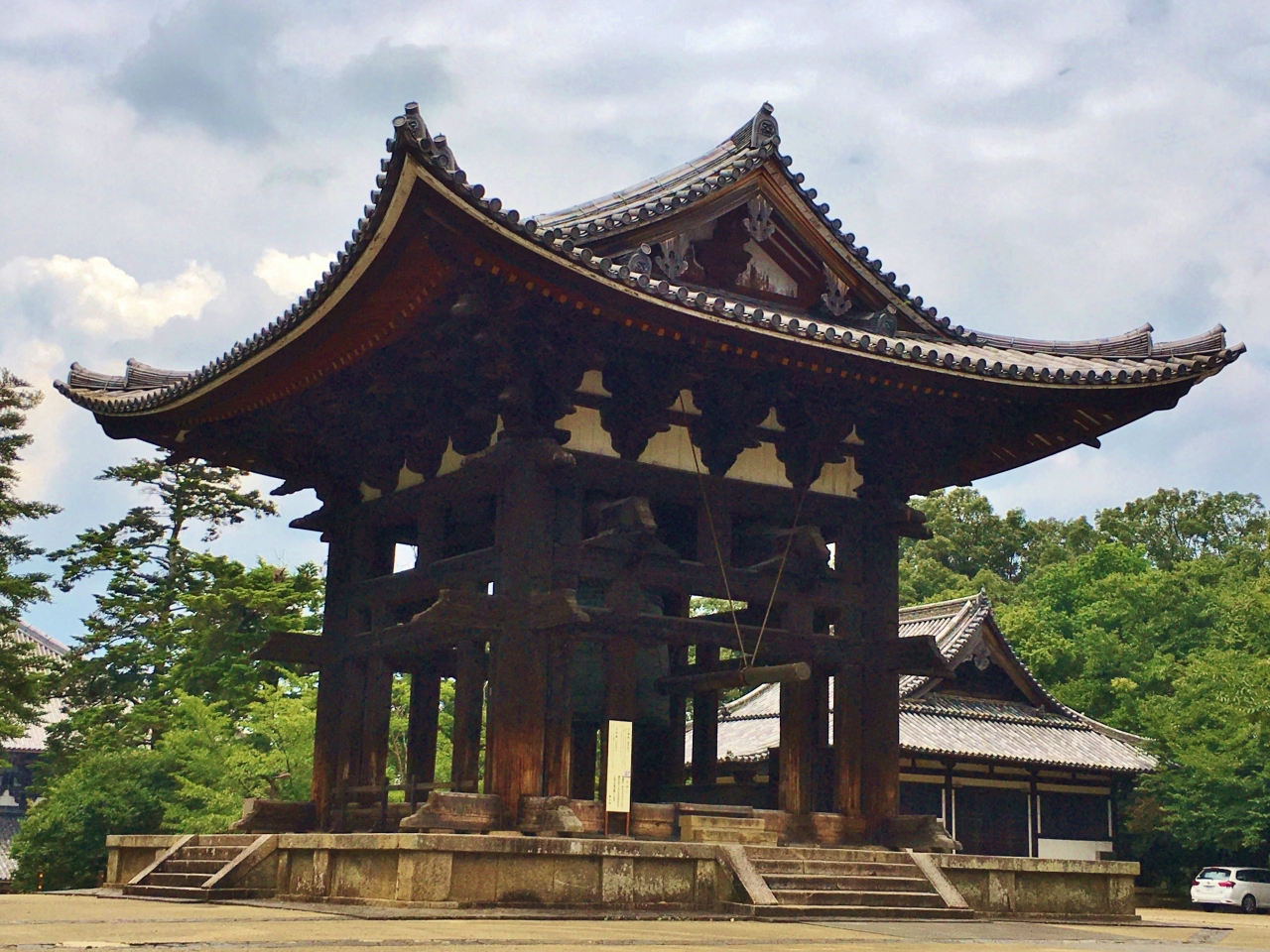 東大寺境内の鐘楼ヶ丘と呼ばれるエリアにあります。大仏殿から二月堂、法華堂(三月堂)方面へ上がる途中に通りました。京都の知恩院・方広寺の鐘とともに「日本三大名鐘」の一つとして知られており、巨大な大鐘と、大鐘を釣る鐘楼はともに国宝に指定されています。間近で見ると圧倒される大きさで、長い歴史をもつ東大寺にふさわしい重厚感ある鐘楼です。