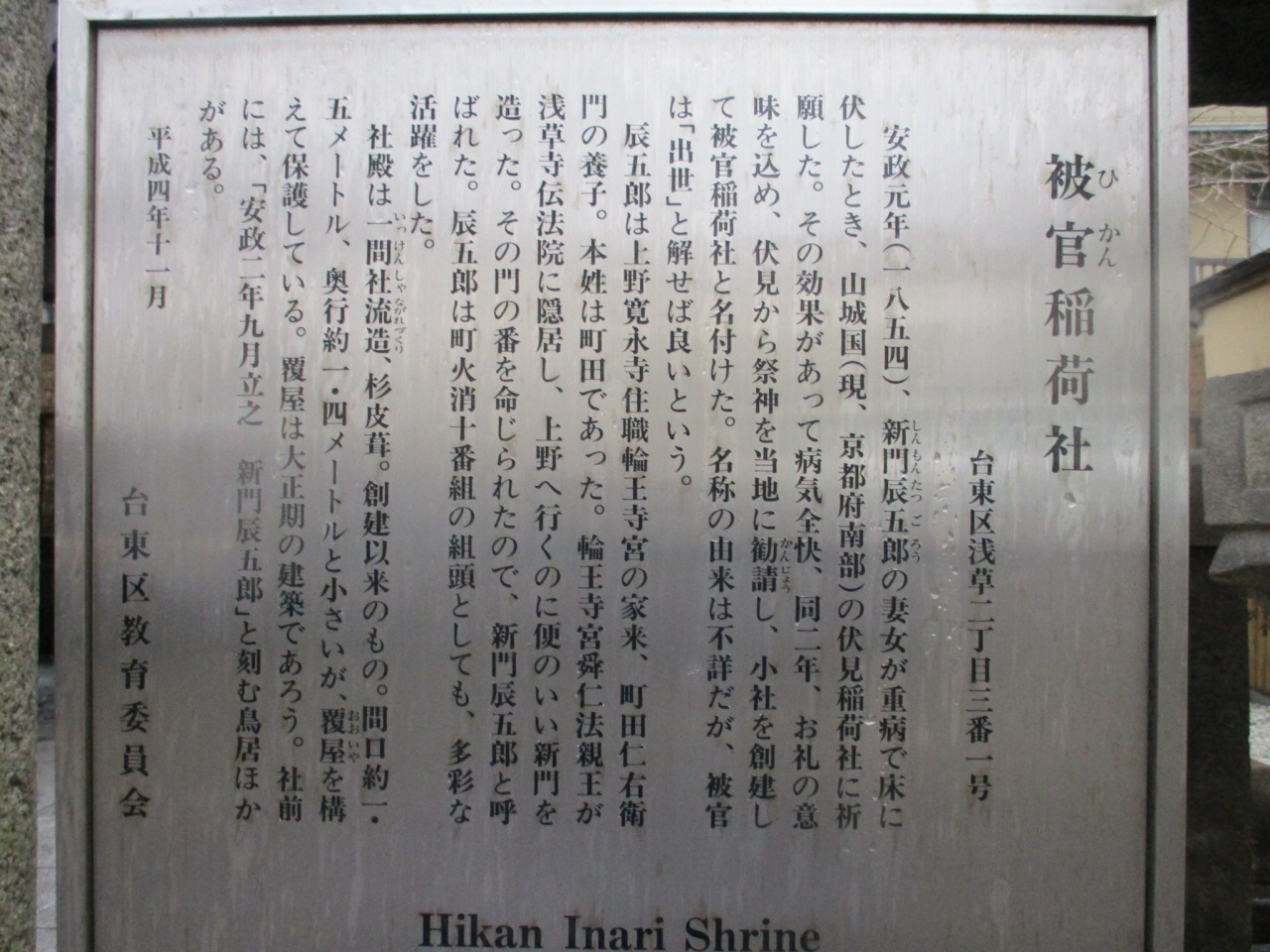 浅草神社の右手の奥にあります。鳥居が至近間隔で3つ並んでいます。被官稲荷神社は京都にある伏見稲荷神社に祀られた神様の分身を勧請し創建されました。官を被るということから、就職や出世のご利益があるそうです。目立たない場所にありますがパワーがありそうな雰囲気でした。