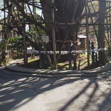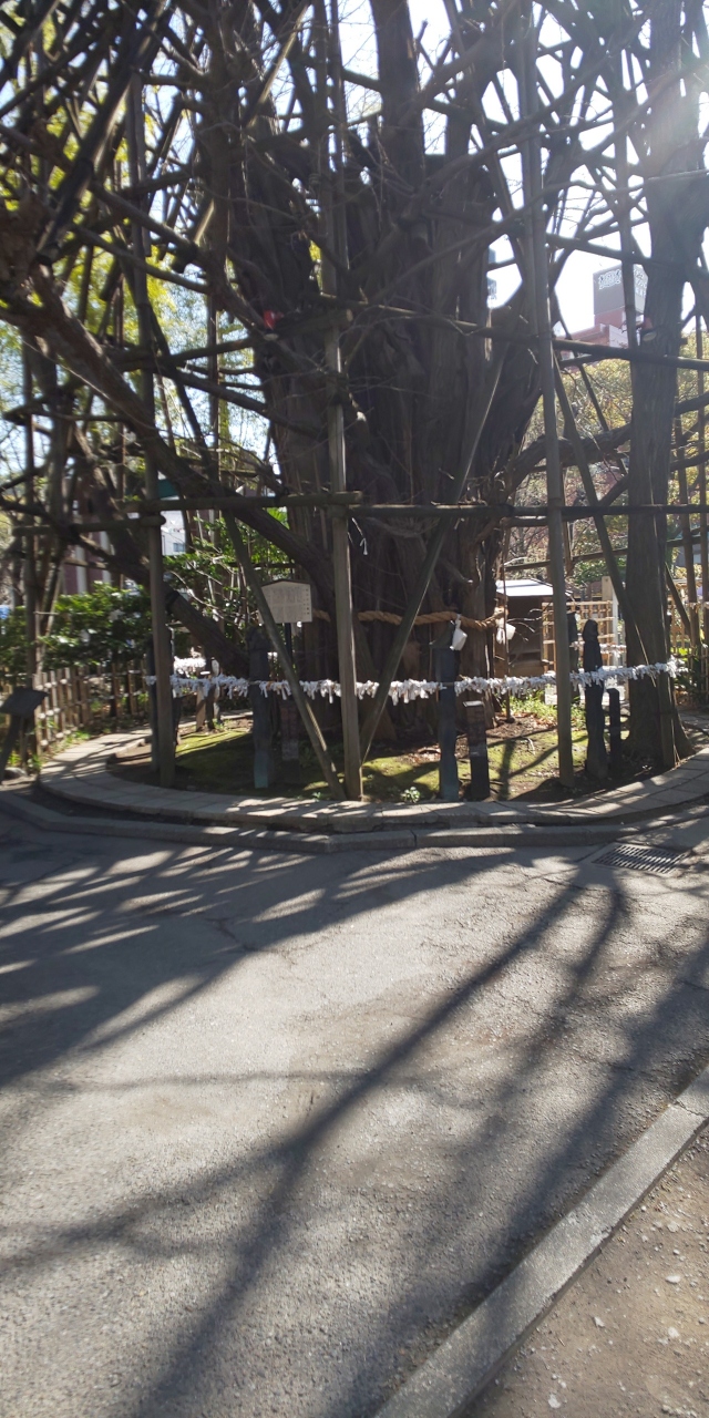 太い稲毛神社の御神木、銀杏の木です。かなり幹が太くて立派さが伝わってきます。万が一のことに備えてなのか、倒壊しないよう木の周りには囲いがされて、御神木を覆っています。