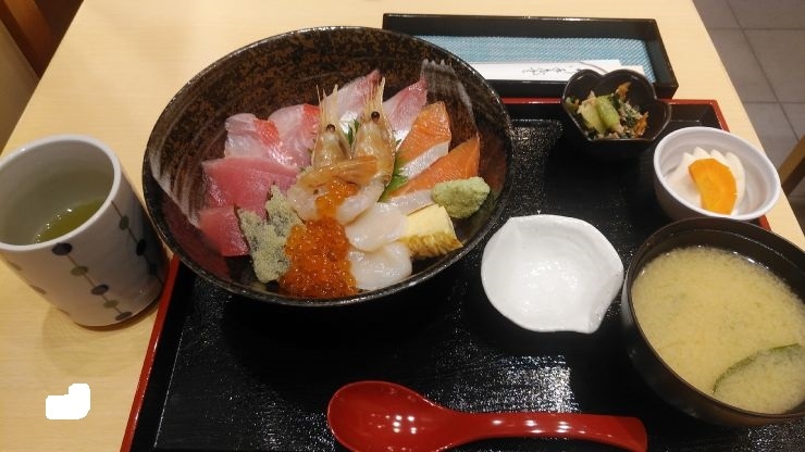 注文した北海丼は定番のマグロ、サーモン、ホタテ、イクラ、エビなどがご飯が隠れるくらいに盛られ、存分にネタを味わうことができた。