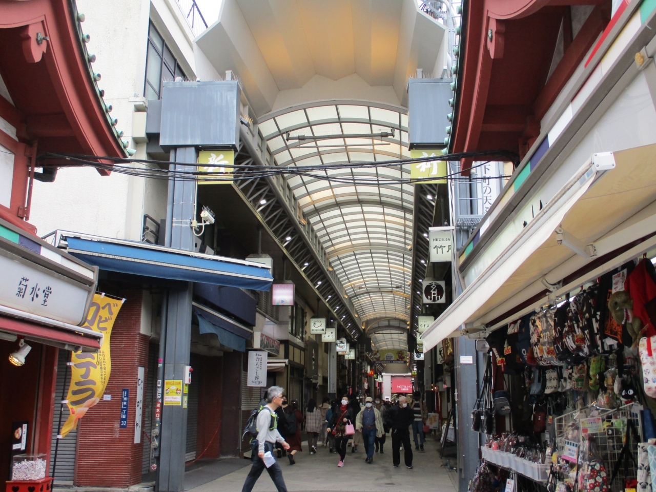 仲見世と交差するようにあるアーケード商店街です。こちらの商店街は、ドラッグストアや生活用品、飲食店、など普通の商店街と同じような雰囲気もありますが、「マルベル堂」という有名なブロマイドのお店もあります。マルベル堂をのぞくと、昭和のスターの商品がいっぱい。一気にタイムスリップした気分になりました。人通りの多い商店街です。