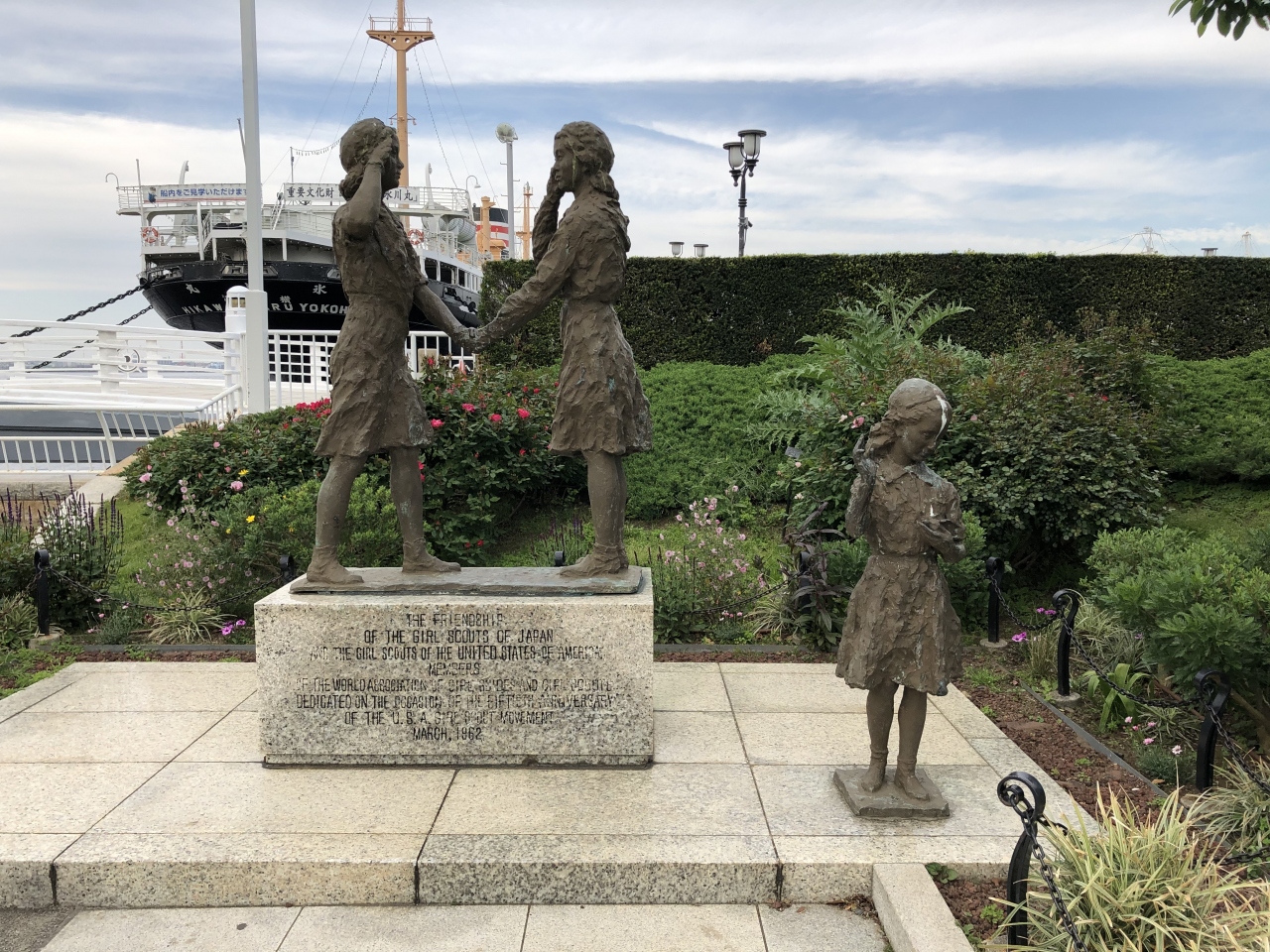 山下公園内にあります。ちょうど氷川丸と一緒に写真に納まる場所に建っているの、記念写真にもよいかと思います。台座の上には握手をしているガールスカウトの制服を着た二人の少女像、そして、台座から少し離れたところにもう一人の少女像があるのがちょっと不思議です。