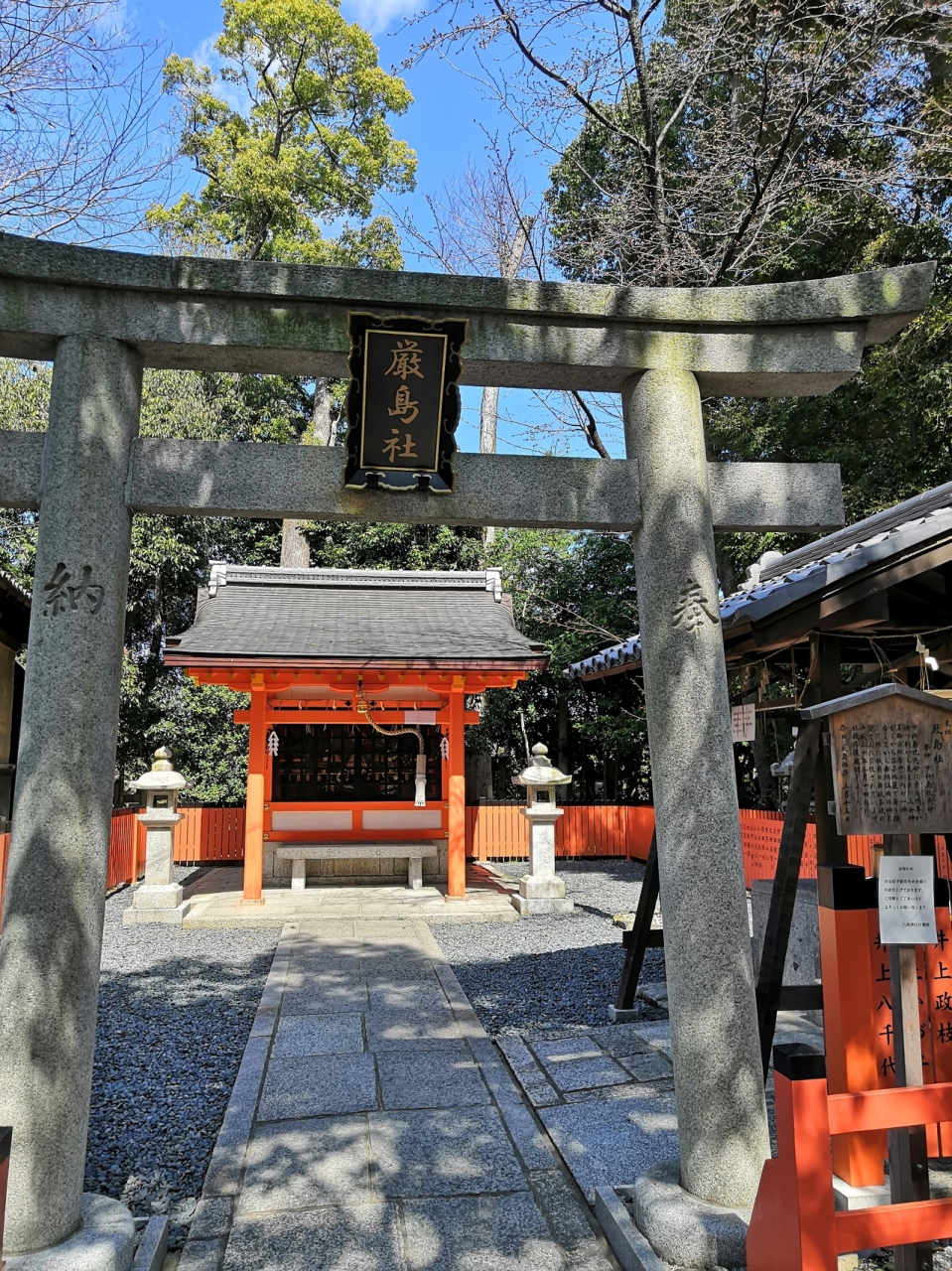 八坂神社の末社の一つです。市杵島比売命(いちきしまひめのみこと)が祭神です。舞踏謡曲の神さまですので、祇園が近いここにはぴったりですね。市杵島比売命は美御前社(うつくしごぜんしゃ)にも祀られているので、両方お参りしたいですね。