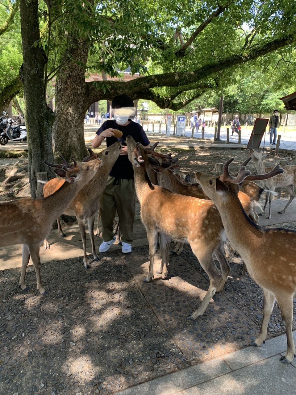 鹿に囲まれて もみくちゃにされている 男性がいて…